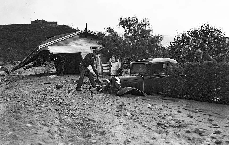 Jan. 2, 1934: Car caught in mud from flooding in La Canada-Montrose. The car is sitting on the pavement of Montrose Avenue.Jan. 1, 1934: Mud, rocks and damaged cars on Montrose Avenue in Montrose after New Year’s flooding.Jan. 2, 1934: Panorama made from three negatives in the Los Angeles Times Archive at UCLA showing mud-covered Honolulu Ave. in Montrose. This panorama was published in the Jan. 3, 1934 Los Angeles Times.Jan. 1, 1934: Cars marooned outside Bohemian Gardens at 3890 Mission Road, East Los Angeles.Jan. 1. 1934: A milk truck is almost completely submerged on Whittier Blvd. under Union Pacific railroad bridge. This photo was published in the Jan. 2, 1934 Los Angeles Times.Jan. 1, 1926: Crowd gathers at the washed out Mesa St. bridge where four people drowned with their auto plunged into the Rubio Wash. The wash is west of San Gabriel Boulevard in the Monterey Park area. This photograph was published in the Jan. 2, 1926 Los Angeles Times.Jan. 1, 1934: Five people drowned when this car and Rush Avenue bridge was swept into the Alhambra Wash, near present day Whittier Narrows Recreation Area. This photo was published in the Jan. 2, 1934 Los Angeles Times.Jan. 4, 1934: Civil Works Administration men from Pasadena help clear Honolulu Ave. in Montrose following flooding during New Year Eve rain storm. This photo was published in the Jan. 5, 1934 Los Angeles Times.Jan. 3, 1934: Following the New Years Eve flooding in Montrose, food kitchen is set up to help survivors. This photo was published in the Jan. 4, 1934 Los Angeles Times.Jan. 1934: American Legion Hall in Montrose following the New Years Eve flood were a dozen people were reported killed. The building was located at the intersection of Fairway Ave. and Rosemont Ave.Jan. 1, 1934: House in La Cresenta-Montose area was swept off its foundation and carried hundreds of feet by New Year Eve flooding. This photo was published in the Jan. 2, 1934 Los Angeles Times.Jan. 2, 1934: Burro used to move water and supplies after New Years Eve flooding in La Crescenta area. This photo was published in the Jan. 3, 1934 Los Angeles Times.Jan. 3, 1934: Cars parked on the dirt, left, show the depth of debris on roadway being cleared on Foothill Blvd., in Montrose. The boulder on right is fifty feet in circumference. This photo was published in the Jan. 4, 1934 Los Angeles Times.Oct. 17, 1934: Cars caught in the flooding on Honolulu Ave., near Rosemont in Montrose. This photo was published in the Oct. 18, 1934 Los Angeles Times. NOTE: Montrose hit twice in 1934 by bad flooding, first on Jan. 1st then Oct. 17.Oct. 18, 1934: Severly damaged home located at Sunset Ave. near Florencita St. in Montrose. This photo was published in the Oct. 18, 1934 Los Angeles Times. Monrose suffered two major floods in 1934, this October event and a more damaging one on Jan. 1, 1934.Oct. 18, 1934: Workers dig out car and remains of home on Glenada Ave. in Montrose following flooding from a storm the night before.Oct. 18, 1934: Garage on Glenda Ave. in Montose is destroyed by flooding, but car survived. This photo was published in the Oct. 19, 1934 Los Angeles Times.Oct. 18, 1934: Water flows through the Hall-Beckley Wash where it intersects with Glenada Ave. in Montrose. This photo was published in the Oct. 19, 1934 Los Angeles Times.Dec. 13, 1934: Workmen at Honolulu and Agner Streets in Montrose setting up sand bags at a known flood danger point. Montorose suffered major flooding in January and October of 1934. This photo was published in the Dec. 14, 1934 Los Angeles Times.