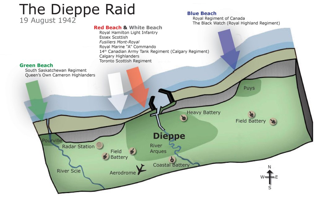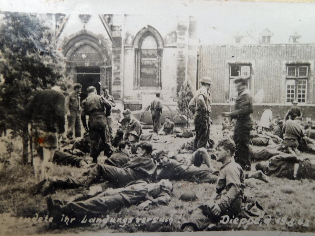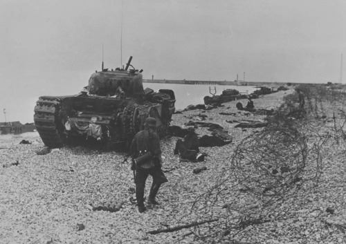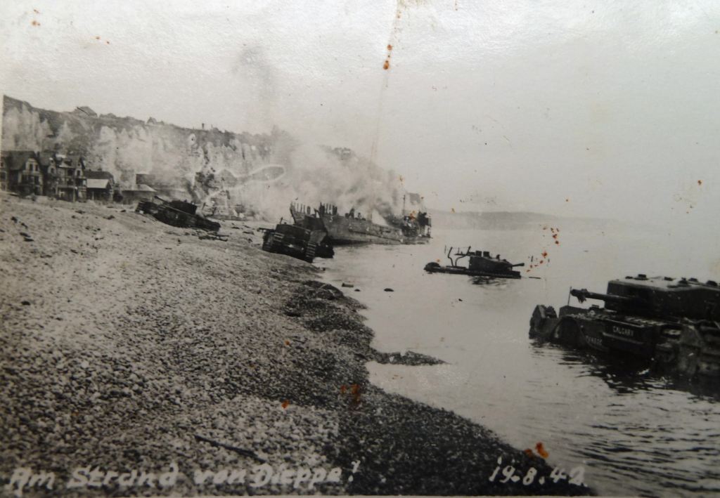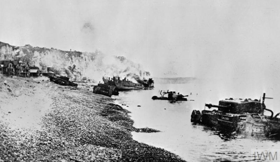 Canadian infantrymen disembarking from a landing craft during a training exercise before Operation JUBILEE, the raid on Dieppe, France. England, August 1942.Brigadier W. Basil Wedd of Headquarters, 1st Canadian Army, placing a wreath on the graves of Canadian soldiers killed at Dieppe on 19 August 1942. Ambleteuse, France, 23 September 1944.British commandos who took part in Operation JUBILEE, the raid on Dieppe, returning to England, 19 August 1942.The carnage of the Dieppe Raid, 19 August 1942The aftermath of the Dieppe Raid, 19 August 1942German soldiers inspect “Bert”, a knocked-out Canadian Churchill tank at Dieppe, August 1942German soldiers walk past “Bert”, a knocked-out Canadian Churchill tank at Dieppe, August 1942German soldiers examine Churchill tanks abandoned by Allied soldiers as they were evacuated.19 August 1942Churchill Tanks and landing craft burning on the beach after the Allied raid on Dieppe. 19 August 1942.Burnt out tanks and landing craft lie strewn across the beach at Dieppe after the Allied withdrawal. Of the 24 landing craft which took part, 10 managed to land a total of 24 tanks, all of which were lost.Damaged Churchill tanks of the Calgary Regiment on the main beach at Dieppe. 19 August 1942German troops examining “Churchill” tank of the Calgary Regiment abandoned during the raid on Dieppe. 19 August 1942Knocked out “Churchill” tanks and the bodies of Canadian soldiers on the beach of Dieppe. France, August 1942A Churchill Mark I of the Calgary Regiment’s “C” Squadron Headquarters knocked out at Dieppe. 19 August 1942A Churchill Mark I of the Calgary Regiment’s “B” Squadron Headquarters knocked out at Dieppe. 19 August 1942A knocked out Churchill Mark II of Regimental Headquarters, The Calgary Regiment at Dieppe. August 1942A Churchill Mark III of 10 Troop “B” Squadron, The Calgary Regiment, on the beach at Dieppe. 19 Aug 1942A Churchill Mark III of 10 Troop “B” Squadron, The Calgary Regiment, immobilized on the beach at Dieppe.19 Aug 1942A Churchill Mark III of 6 Troop “B” Squadron, The Calgary Regiment, immobilized with her left track broken by enemy fire on the Promenade at Dieppe.“The Dieppe Raid” by Charles ComfortCanadian POWs Being Marched Into CaptivityCanadian POWs At The Dieppe HospitalAfter the BattleThe beach after the battle.Canadian dead on Blue beach at Puys. Trapped between the beach and high sea wall (fortified with barbed wire), they made easy enfilade targets for MG34 machine guns in a German bunker. The bunker firing slit is visible in the distance, just above the German soldier’s head.No.3 Commando returning to Newhaven after the Dieppe Raid, August 1942Dieppe’s chert beach and cliff immediately following the raid on 19 August 1942. A Dingo Scout Car has been abandoned.A German MG34 medium machine gun emplacement. Dieppe, France. August 1942.Destroyed landing craft on fire with Canadian dead on the beach. A concrete gun emplacement on the right covers the whole beach. The steep gradient can clearly be judged.Canadian wounded and abandoned Churchill tanks after the raid. A landing craft is on fire in the background.Daimler Dingo armoured car and two Churchill tanks bogged down on the shingle beach. The nearest Churchill tank has a flame thrower mounted in the hull, and the rear tank has lost a track. Both have attachments to heighten their exhausts for wading through the surf.Canadian dead at Dieppe, August 1942Canadian prisoners being led away through Dieppe after the raid.British and Canadian prisoners at Dieppe, August 1942Canadian and British dead at Dieppe, August 1942German soldiers examine a Canadian Churchill tank at DieppeA member of the German Navy poses with a Canadian machete next to a disabled Allied Churchill tank on the beaches of Dieppe after the Dieppe Raid.Map of Dieppe Raid with photographic detailsGerman officers on the beach with fallen Canadian soldiers after the Dieppe Raid, 19 August 1942German soldiers attempting to salvage destroyed Canadian tank. August 1942.Canadian POW drinking from his helmet after the Dieppe Raid. 19 August 1942An aerial photograph of Dieppe during the landings showing a substantial fire burning on the frontAwaiting transhipment to prisoner of war camps after the Dieppe raid. 19 August 1942Awaiting transhipment to prisoner of war camps after the Dieppe raid. 19 August 1942Captured soldiers being marched through Dieppe. 19 August 1942The beach at Dieppe after the raid. 19 August 1942German personnel surveying an abandoned Allied tank. 19 August 1942An Allied soldier after the Dieppe Raid. August 1942.The beach the day after the Dieppe Raid. 20 August 1942Germans guarding the Canadian prisoners after the Battle of Dieppe. August 1942At Pourville, outside Dieppe, wounded Canadians lie at the side of the road as the battle continues in the background. 19 August 1942Exhausted Canadian soldiers await transport under the watchful eye of their German captors after the battle of Dieppe. Aug 1942A Dornier Do 217 being downed by a Supermarine Spitfire Mark VB flown by Flight Lieutenant Kazimierz Rutkowski of No. 317 Polish Fighter Squadron during the Dieppe Raid.The aftermath of the Dieppe Raid. 19 August 1942The aftermath of the Dieppe Raid. 19 August 1942Damaged Churchill tanks of the Calgary Regiment on the main beach at Dieppe. 19 August 1942Canadians taken prisoner after surrender at Dieppe. 19 August 1942.Evacuation of wounded.Allied troops arriving back in England after the Dieppe Raid.Weary soldiers back in England after the Dieppe Raid.Captain Jock Anderson of the Royal Regiment of Canada, cup of tea in hand, recounts his experiences to Brigadier Tees after disembarking at Portsmouth.A wounded Canadian soldier being disembarked from a Polish destroyer at Portsmouth on return from Dieppe, 19 August 1942.Three Canadian soldiers gather around their supplies in the shelter of the sea wall at Dieppe.19 August 1942Canadian troops resting on board a dest