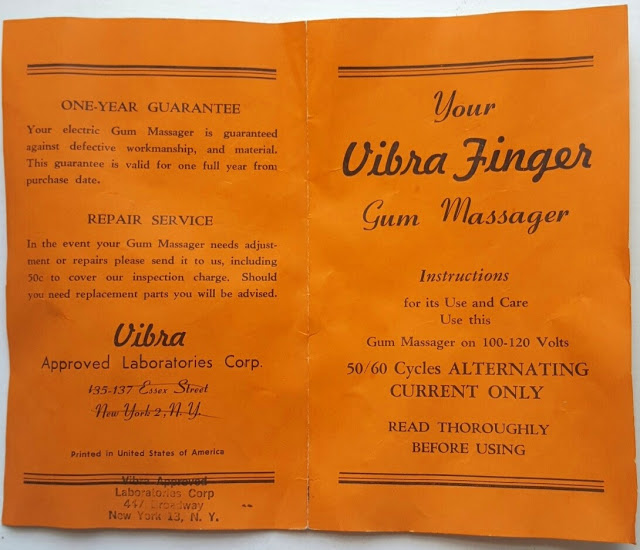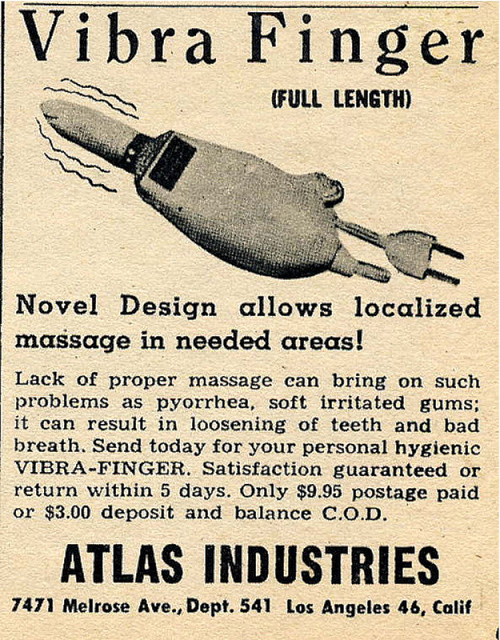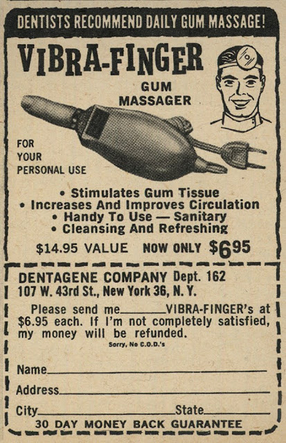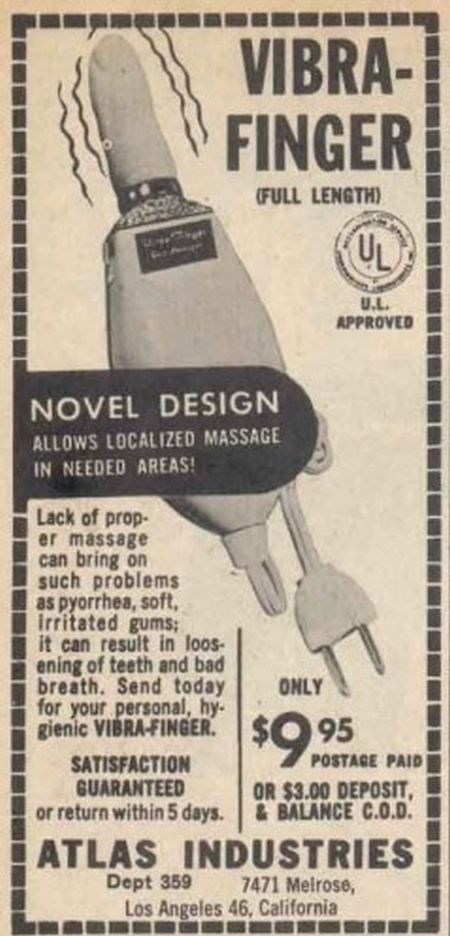 Are you lacking a massage in certain needed areas? Then the Vibra-Finger is for you! Whatever that means, but this 1950s massager was dentist-approved.