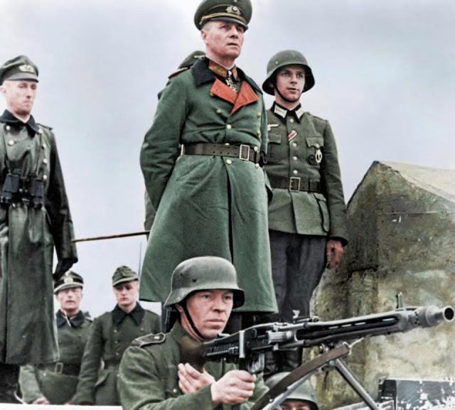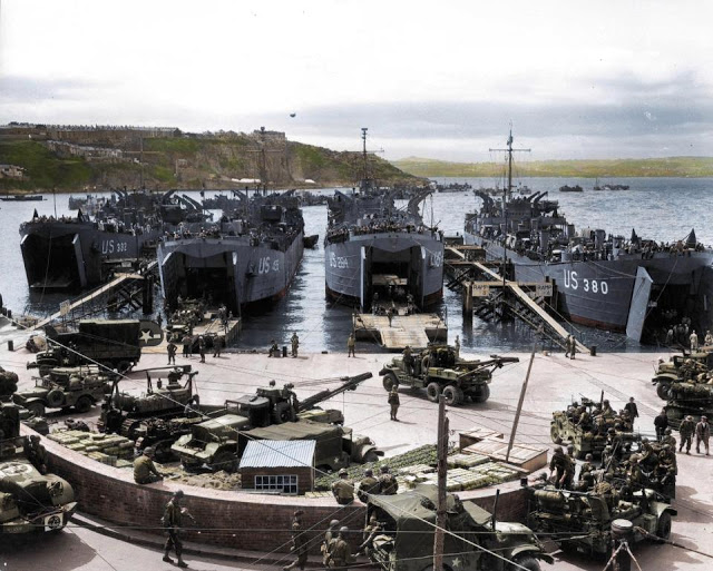 The astonishing scale of the invasion can be seen in this image taken of the American forces arriving on Utah Beach.U.S. troops from the USS Joseph T. Dickman wait to disembark from their landing craft as they approach Utah Beach on June 6 1944.A craft from the USS Samuel Chase lands troops of the US Army First Division on Omaha Beach.Glider pilots take the opportunity for a quick cigarette as they are crowded onto a landing craft.Royal Marines descend from landing craft with their heavy backpacks, weapons and equipment on Juno beach.American troops arrive on a Normandy beach in a lengthy procession from their landing crafts.British troops show their true grit as they help injured comrades onto Sword Beach.US Army Fourth Infantry Division troops take a breather after making their way onto Utah Red Beach.British Airborne Pathfinders check their watches on the night before the invasion.Reinforcements arrive by sea to bolster U.S. troop numbers on the Normandy front.The USS LST-21, manned by the U.S. coastguard unloads British Army tanks and trucks onto a Rhino barge in the opening hours of their invasion of Gold Beach.Troops load U.S. LSTs with artillery equipment, vehicles and troops in Brixham, England before they head for Normandy.Nazi General Erwin Rommel inspects defences ahead of D-Day. On the actual day of the invasion he was away from the front celebrating his wife’s birthday.German troops camouflage a Panzer VI Tiger tank with undergrowth in the Normandy village of Villers-Bocage.Members of the 22nd Independent Parachute Company, 6th Airborne Division attend a briefing ahead of the D-Day invasion.Troops establish a radio communications post after landing.