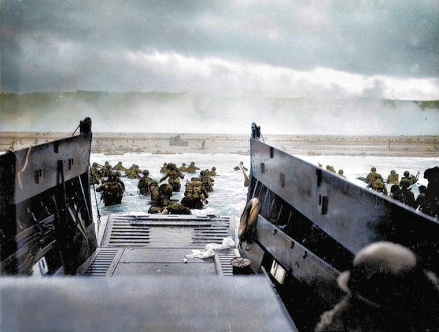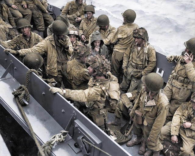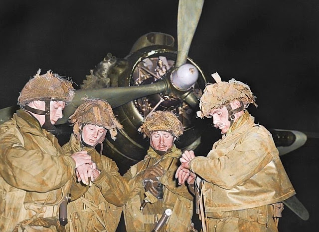 Striking shots show men storming French beaches under ominous grey skies for the invasion, glider pilots on landing craft, and British Airborne Pathfinders at Harwell checking their watches on the night of June 5, 1944, hours before the battle commenced.