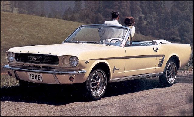 Born from the imagination of Lee Iacocca, vice president and general manager of the Ford Division, the first Ford Mustang debuted on April 17, 1964 at the World’s Fair in New York. This Mustang, which was available as a coupe or convertible, featured chrome wrap around bumpers, a lengthened hood, and a shortened rear deck. The grille was honeycomb patterned, with a centered running horse in corral logo and horizontal and vertical bars extending from the corral.