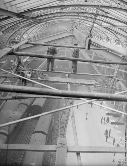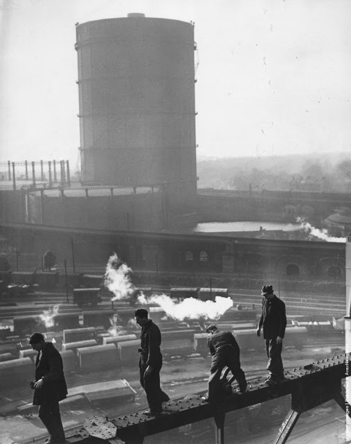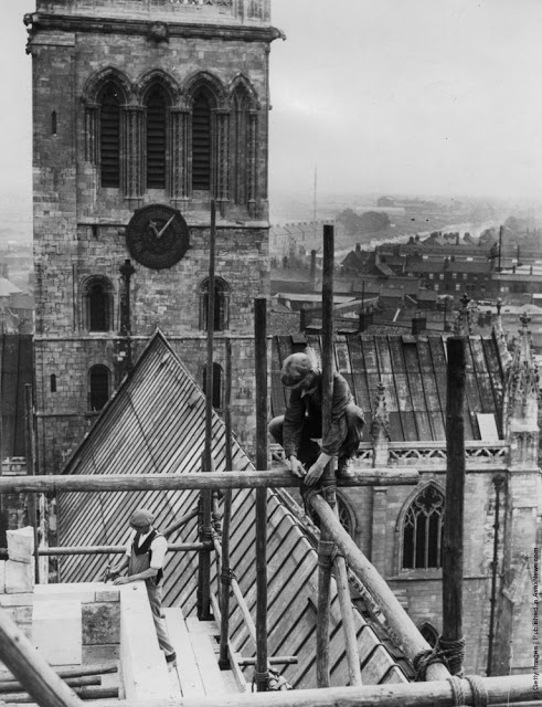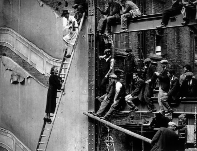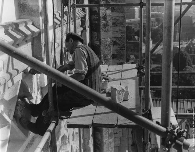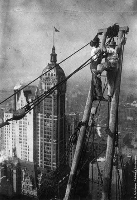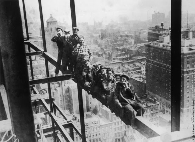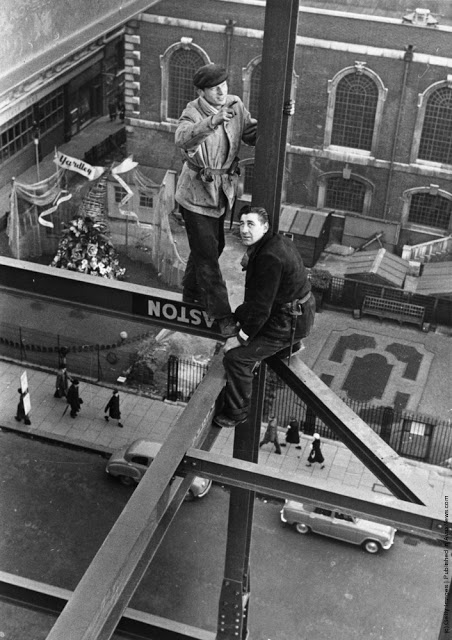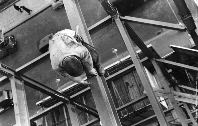 A workman takes a siesta on a girder during the building of Radio City, the city of New York spread out below. 1933Two waiters serve two steel workers lunch, on a girder high above New York City, 14th November 1930. The building upon which they are perched is the Waldorf-Astoria Hotel on Park Avenue, under construction by Thompson-Starrett. The building in the bottom left is the New York Central Building, later the Helmsley Building.A scaffolder making his way across a steel girder 70 feet above the ground. 1955A stonemason at work on the south face of Canterbury Cathedrals Bell Harry Tower. 1964A steel construction worker crosses a steel girder with a foothold of a mere 1.75 inches. 195520th November 1925. An American construction worker walking blindfolded on a construction girder twenty stories high in New York City. 20th November 1925.English comedienne and singer Gracie Fields (Grace Stansfield, 1898–1979) singing to workmen at Londons Prince of Wales Theatre after laying its foundation stone. 1937Daily Express newspaper photographer Terry Fincher on a parachuting exercise. 196513th August 1931. A workman renovating the Gothic spires of the cathedral of St Peters in York Minster. 1931Circa 1930. A construction worker crouches over the end of a girder high above the streets of New York. 193013th April 1932. Two workmen walking along a girder during the building of the Freemasons Hospital, Ravenscourt Park, London are silhouetted against the sky. 19323rd October 1933. Two men working on a girder in Blackpool Tower. 193323rd February 1937. A riveter carrying out repairs to the main girders of the Blackpool Tower in preparation for the coming holiday season. 1937August 1935. Workmen painting girders beneath the roof of Liverpool Street Station, London. August 1935.8th March 1937. Workmen on scaffolding at the top of the spire of St Johns church in Cardiff, where they are carrying out repairs. 1937Constructions workers sitting on a hoisting ball above the New York city skyline. 1925 The Singer Building is in the background. 1925Workmen demolishing the walls of a bomb wrecked building, whilst below them work has started on the foundations for a new office block. 1954Workmen from the Office of Works perch 70 feet above the ground to clean the horses heads of the quadriga statue on the Wellington Memorial at Londons Hyde Park Corner. 195826th July 1935. New West Towers being finished at Selby Abbey in Yorkshire.14th February 1951. Men at work on Battersea Power Station walking along a narrow girder with trains and the gasometer in the background.A steel worker balances on a girder during the construction of the Empire State Building in New York City. The Chrysler Building can be seen in the background. 1931The eleventh most dangerous occupation in America is that of the rivet tosser. Insurance companies will not issue life or accident insurance cover to these people. 1950Harmonica playing steel workers perched on a girder on the 22nd storey of the Murray Hill building, New York. 193018th April 1934. A steeplejack painting the flagstaff on Australia House, London, with St Clements Dane Church behind him.30th December 1966. A man does a handstand on a girder high above a street in London.