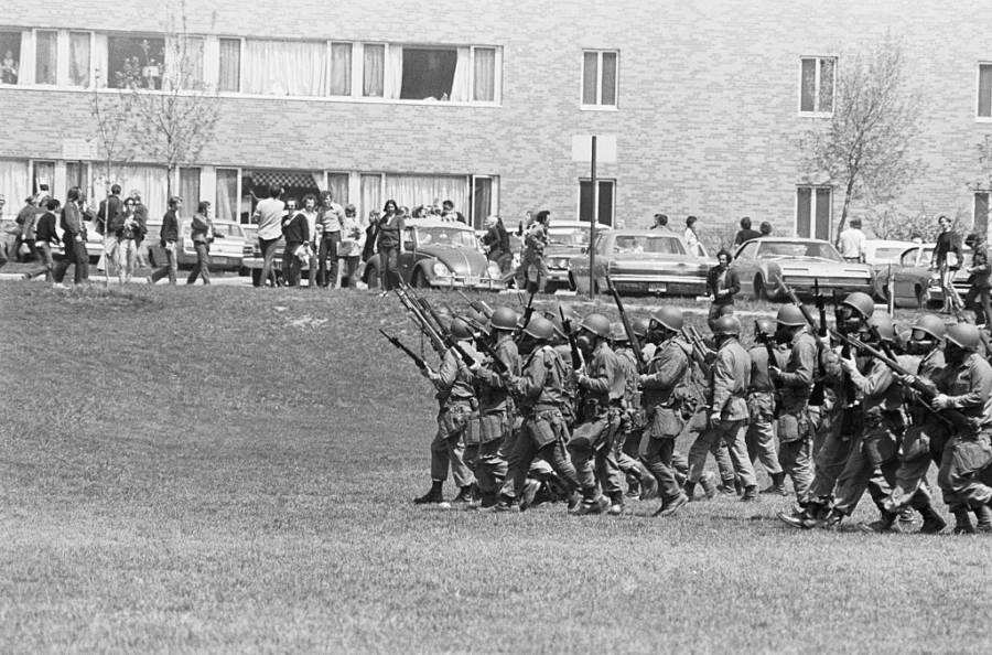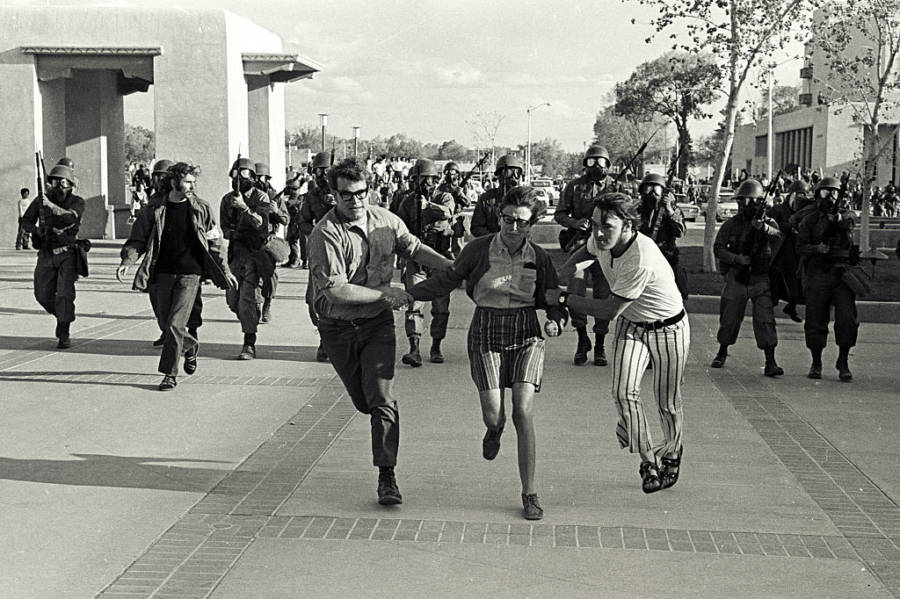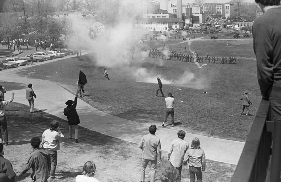 The National Guardsmen hurled tear gas into the crowd and chased the people who fled. Then, when some demonstrators wouldn’t leave and tried to hurl the tear gas back at them, they pulled out their rifles and opened fire.