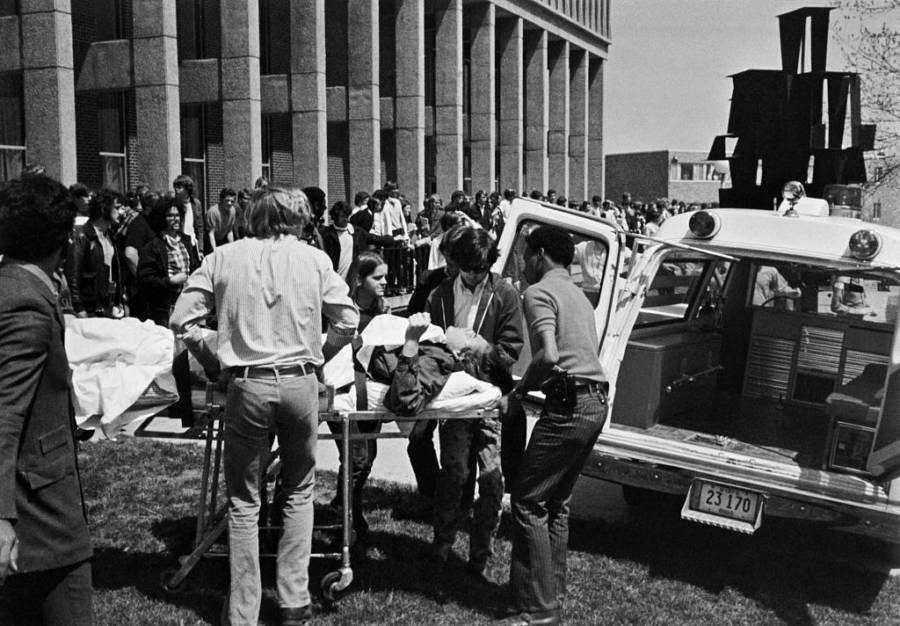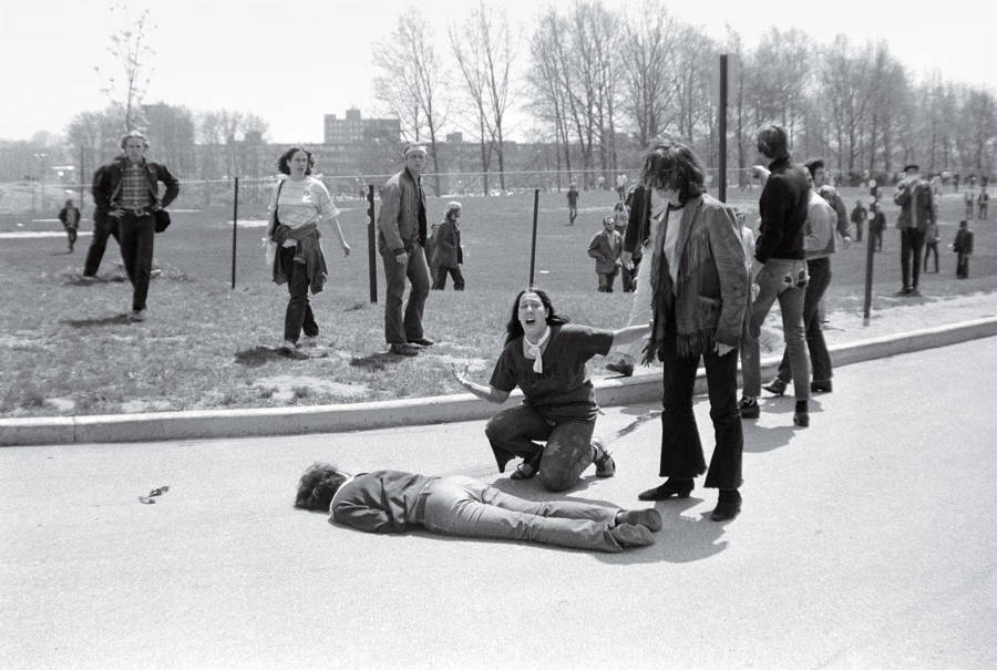 “The crackle of the rifle volley cut the suddenly still air,” John Kifner, a New York Times writer who was on the scene, wrote. “It appeared to go on, as a solid volley, for perhaps a full minute or a little longer.” Kifner watched as the students next to him fell to the ground, one shot in the head, another hit in the back, and saw them bleed out onto the concrete of their school parking lot.