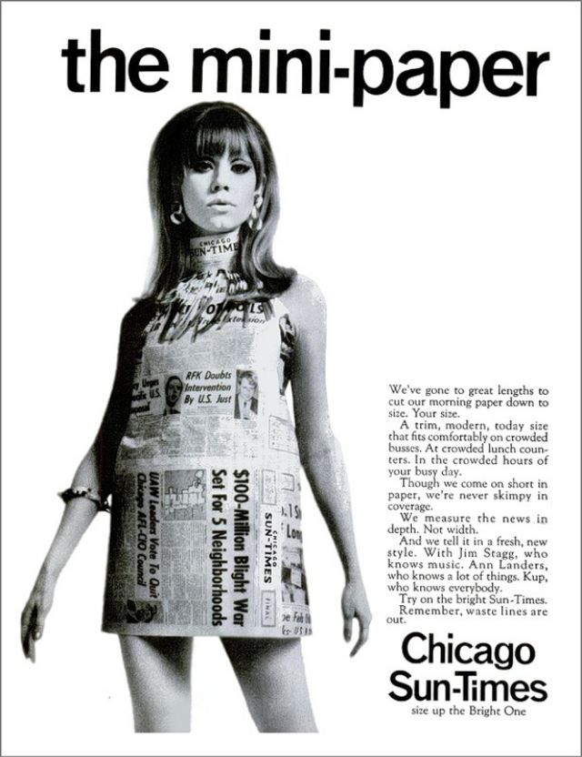 ‘Disposable’ clothing reached its peak around 1966-68 but was generally more of a gimmick than a viable alternative. Society was adopting an increasingly ‘throw-away’ attitude; disposable cutlery, and cigarette lighters were already commonplace. Throw-away clothes, furniture etc. were the next logical step.