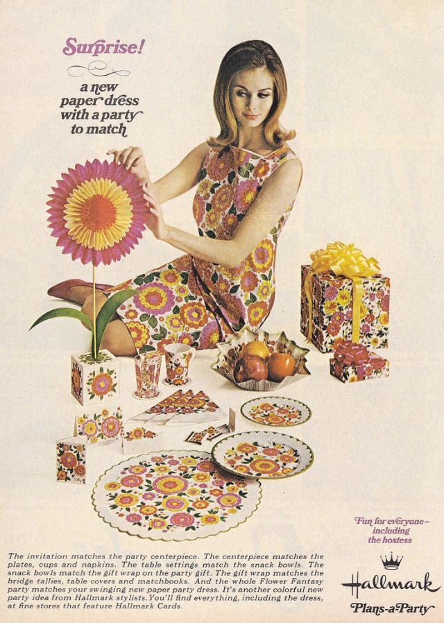 What began as a mail order business turned into a huge fad. Paper dresses were sold conveniently in drug and grocery stores as well as department stores and boutiques. Consumers often could buy matching paper party decorations right along with the disposable clothes. The disposability of the garments and their expedient purchase implied modernity and leisure. Paper dresses were an attractive alternative since you could shorten them with a pair of scissors and mend them with scotch tape, or throw them away when they got soiled.