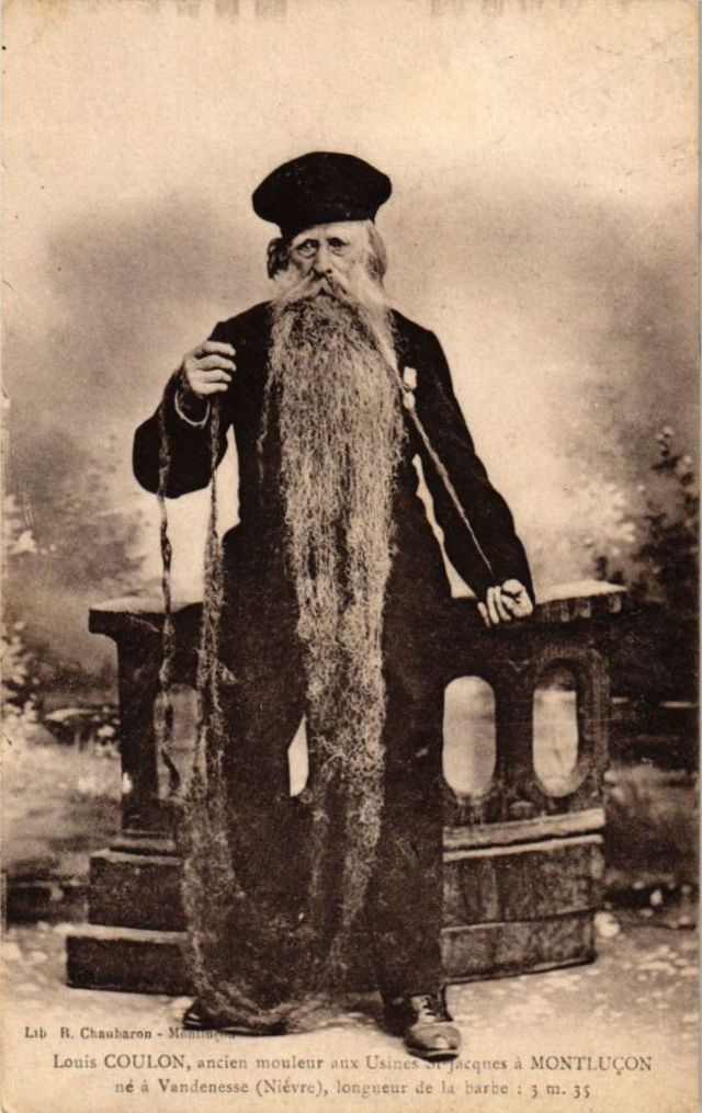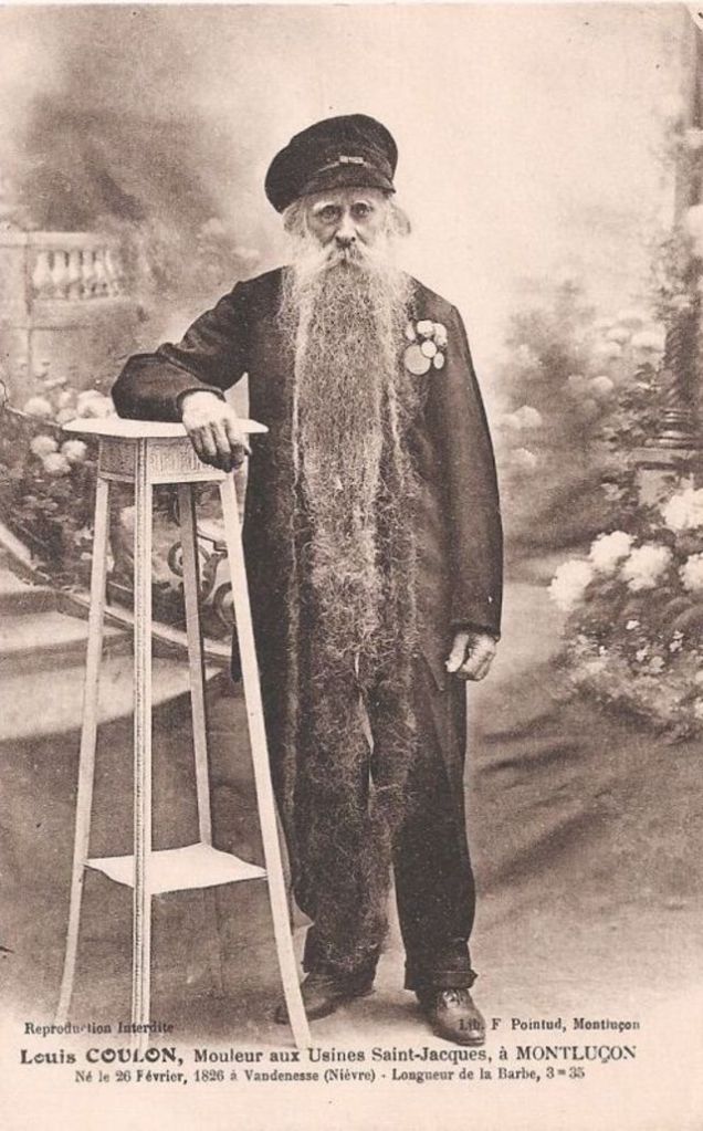 Born on February 26, 1826 in Vandenesse (Niève), Louis Coulon was a “cast iron moulder” at the Forey factory in Montluçon. Apparently, he was already shaving by age 12 but could not maintain the sharpness of his razor blade from its frequent use. In fact, his beard was growing so fast that by age 14, Coulon already had a 50 centimeter (19.6 inch) beard. From then on, it was just a matter of letting it grow to monstrous length.