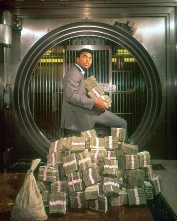 Muhammad Ali poses with his prize winnings during a photoshoot in 1964.