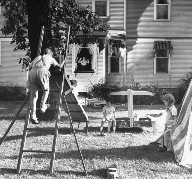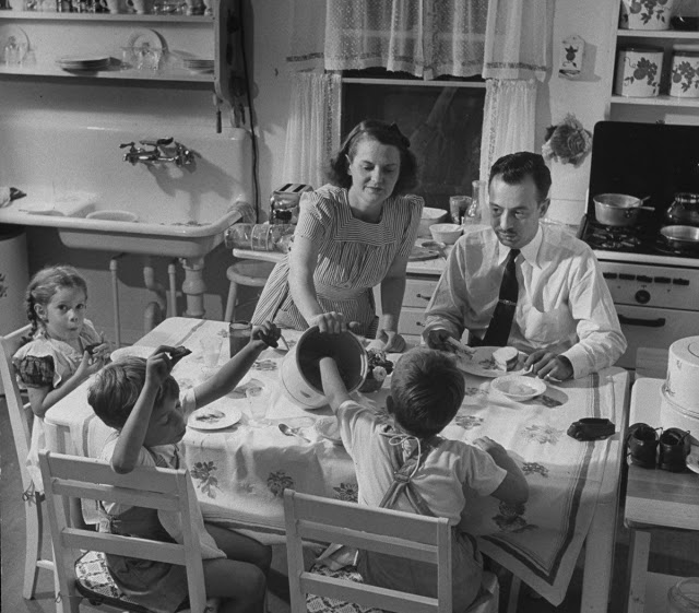 Jane busy straightening up before launching into some heavy cleaning with dust mop and carpet sweeper.Jane making one of the four beds she does daily, after doing breakfast dishes and getting the kids to school.Jane scrubbing the bathtub in bathroom at home.Jane with Peter, Tony and Pamela, as they go to the drugstore to buy ice cream cones, after the boys had haircuts at local barbershop in town.Jane using pop-up toaster, as she makes sandwiches for her three children.Jane conferring with a mechanic at gas station about the car she uses to chauffeur her husband to and from his office, plus get the children back and forth to school.Jane mending a pair of socks as she lounges in bedroom while listening to her favorite jazz records during her leisure hours (time with out kids).Jane loading the automatic washing machine with several days’ dirty clothes, in basement at home.Jane bathing her daughter Pamela, 4, before dressing her for bed at night.Jane standing on ladder to place special china plate as decoration above the doorway in the living room, which she decorated herself, as her son Tony plays on the floor.Jane rapping admonishingly on the window in the background as she oversees her kids Peter, 7, climbing the slide ladder, while Tony, 5, blocks the slide, and Pamela gets kicked out of the tent while playing with a neighbor’s children.Jane prepares for a dinner party.Jane chatting with her dinner guests Mr. Bert Miller and wife, as her husband Gilbert stands behind her, carving a roast beef to be served at the table.Jane shushing her husband Gilbert, as they sit having a quiet 6:30 a.m. breakfast before their three kids wake up, in the kitchen at their home.Jane serving lunch to her husband Gilbert, who has come home from the office a few minutes away, and her ever-present kids.Jane posing with her husband of 11 years, Gilbert, and their three kids Pamela, 4, Tony, 5, and Peter, 7, in front of the large two-story house they lease.Jane dancing with her husband Gilbert (third from left) amidst other couples at their country club’s formal dance.