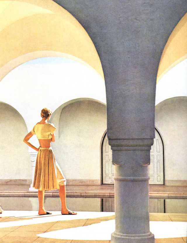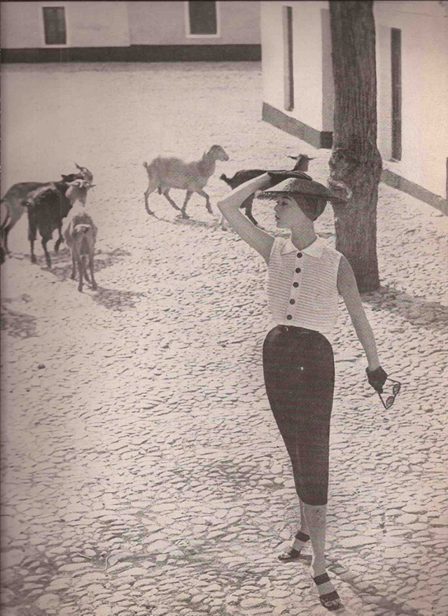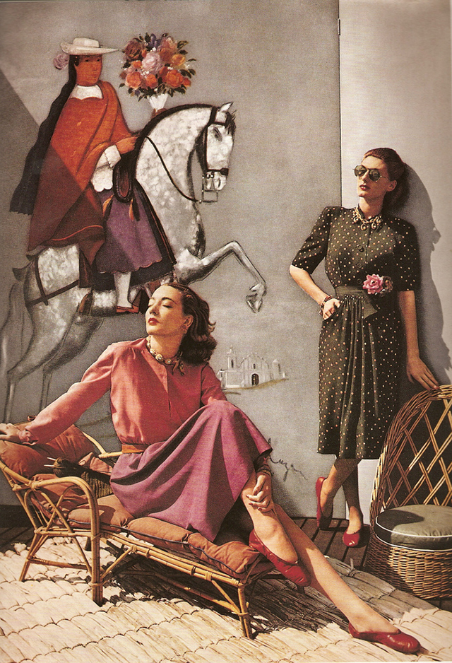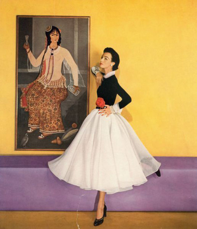 Dahl-Wolfe often juxtaposed her models with famous works of art, resulting in surprising and irreverent compositions. Fashion assignments led her to locations around the world, where she posed her models outdoors, in natural light. Throughout this period, Dahl-Wolfe also created striking portrait photographs of society figures and art world celebrities, including authors Carson McCullers and Colette, designer Christian Dior, and sculptor Isamu Noguchi.