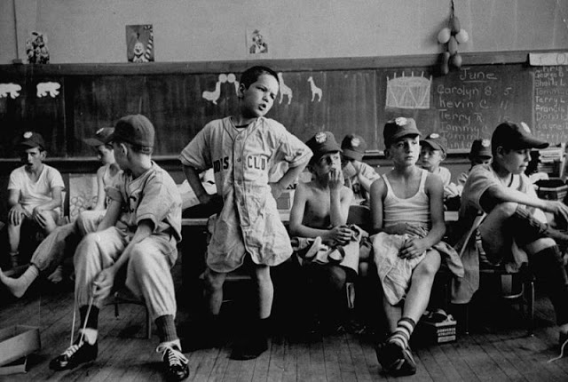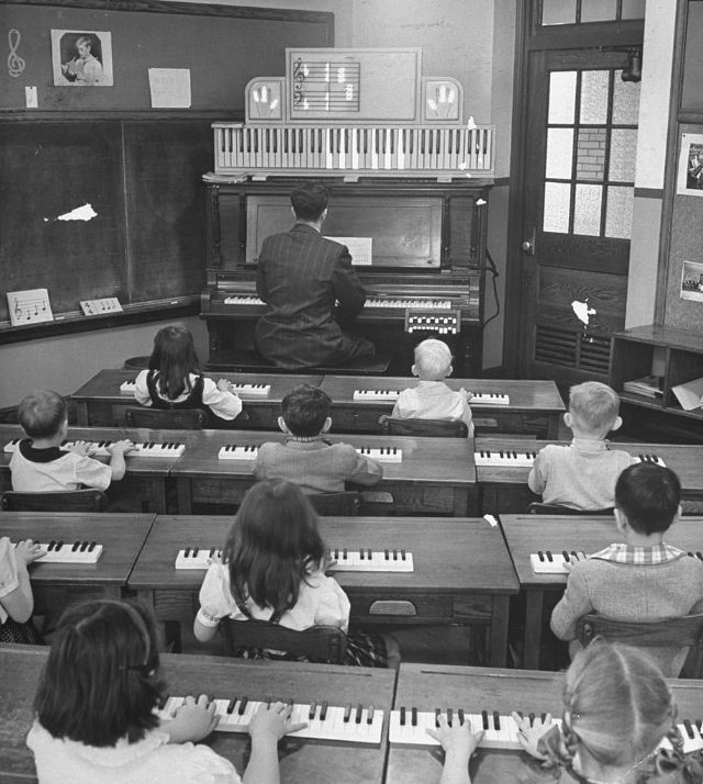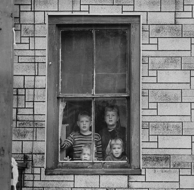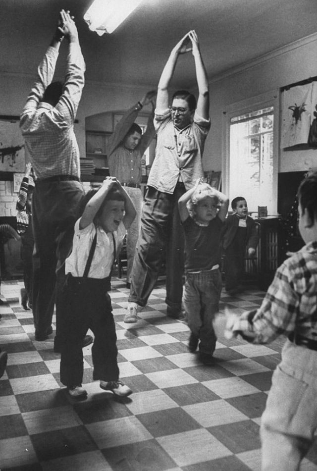 Small flock of chickens in Swiss farmyard being fed by girl of the farm family, Switzerland, 1947.Elementary school music teacher playing F-Major chord on piano while corresponding keys light up on plastic keyboard model above him as do finger chart for L & R hand & notation for Treble a Bass clefs while student watch & immitate on dummy keyboards, 1947.A boy dancing while the French gypsies around him playing music and watching, France, 1948.Children watching circus show, Switzerland, 1948.Child actor Chet R. Allen mulls over his lines in a classroom in which boys’ choir used as a dressing room, 1952.A small boy playing in a tree during springtime in Clarksville, Arkansas, 1953.Kids playing outdoors during springtime in Clarksville, Arkansas, 1953.Children petting on of the winning dogs of the Mutt Derby, Topsfield, Massachusetts, 1953.Children petting a dog at a Mutt Derby event, Topsfield, Massachusetts, 1953.Group of boys club little league baseball players putting on their uniforms while sitting in classroom of school prior to playing a game, Manchester, New Hampshire, 1954.A boy playing catcher during a Little League baseball game, 1954.Children participating in a bicycle safety program run by the police, New York, 1954.Fathers and their children imitating giraffes during play period of special Father’s Day at co-op nursery school owned by parents, New York, 1955.Children looking out the window of a building in the neighborhood of the Mad Bomber, 1957.A father giving his children haircuts, 1958.Children playing on a playground, 1958.Second graders using abaci especially designed to teach them arithmetic, Columbus, Ohio, 1958.Children playing on a swing set, 1958.School children visiting the British aircraft carrier HMS ‘Ark Royal,’ 1961.Children wearing Batman costumes in a New York dance class, 1966.Two children, both dressed in Batman capes, jump in front of a studio mirror during a dance class, New York, 1966.A girl playing with a clown at the ‘HemisFair’ in San Antonio, Texas, 1968.