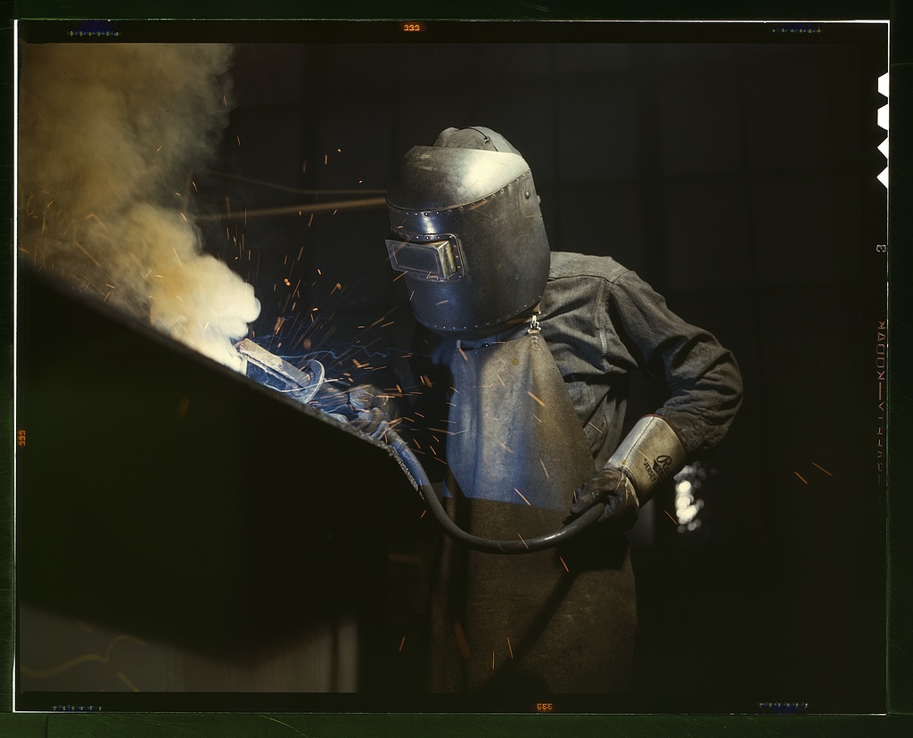 In 1939 when Hitler attacked Poland the United States ranked twentieth as a world military power. In June of 1940 President Roosevelt and Congress passed a bill for the building of a major two ocean navy. At that time Roosevelt formed the National Defense Advisory Commission of the Office of Emergency Management (OEM) and Palmer was chosen to head the photography department. To rally and inform citizens about the use of their tax dollars and resources, Palmer was sent out to photograph Americans building what Roosevelt termed the Arsenal of Democracy…