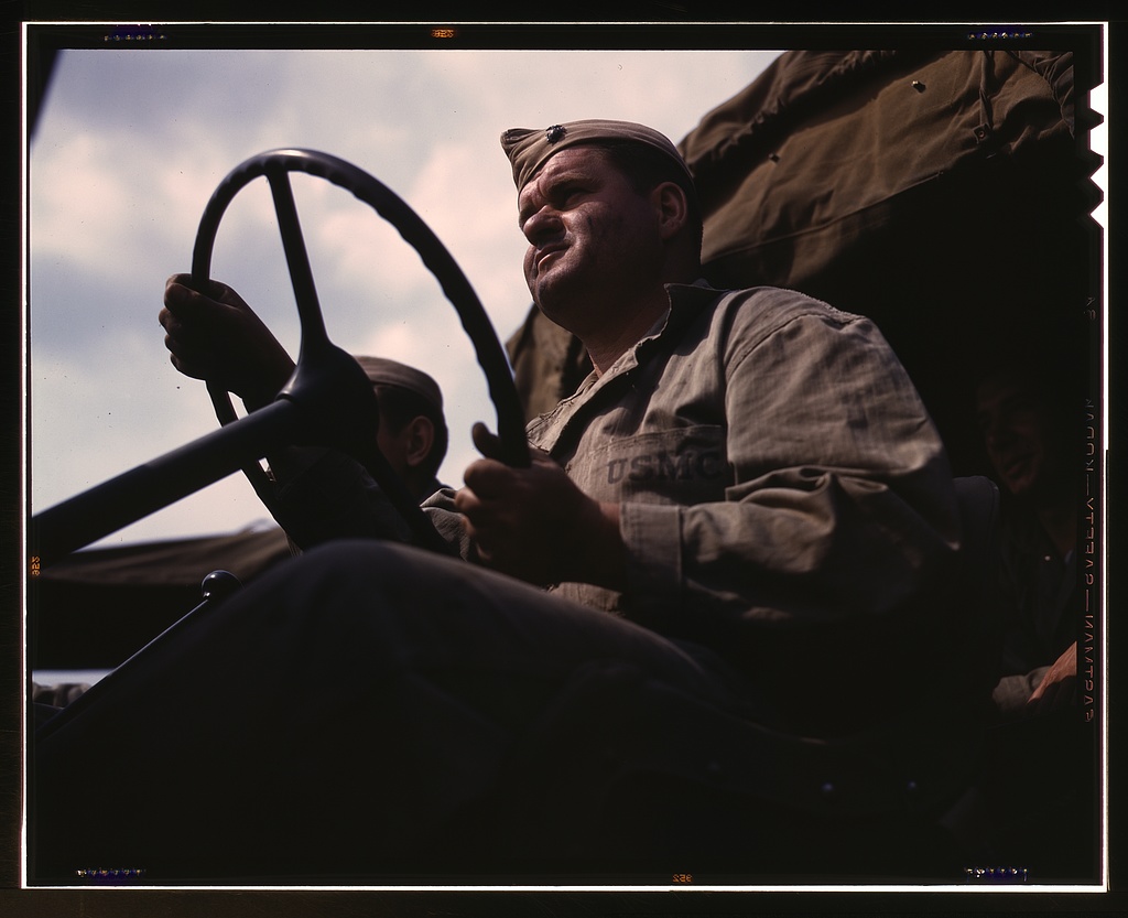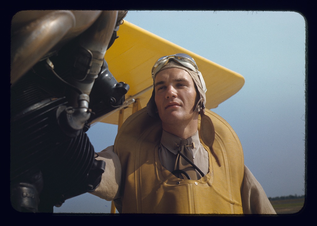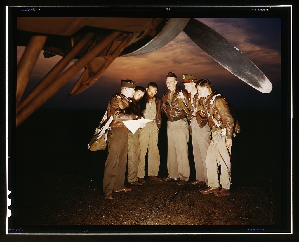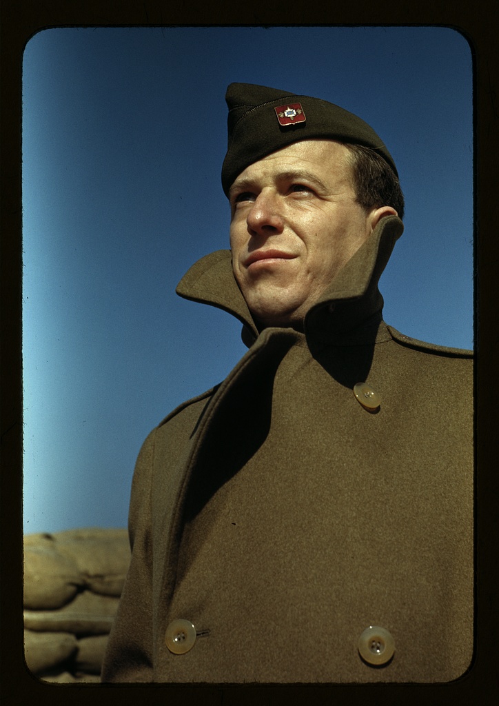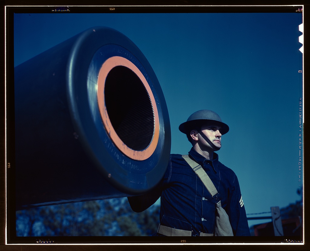 Alfred T. Palmer’s (1906–1993) color photographs for the US Farm Security Administration / Office of War Information speak with a loud, bold, clear and consistent voice. They say: ‘Heroes.’ They might also add, “To infinity and beyond”, given that so many of the men in uniform are gazing upwards to the rosy-fingered dawn, just as we gaze up at the strong chins and keen eyes. The women are focused on the job in hand. Immaculate in complexion and attire, these “capable” women are vivid and bright, immortalised in solid blocks of color. Contrasted against the darkened backdrop, they epitomise dependability.