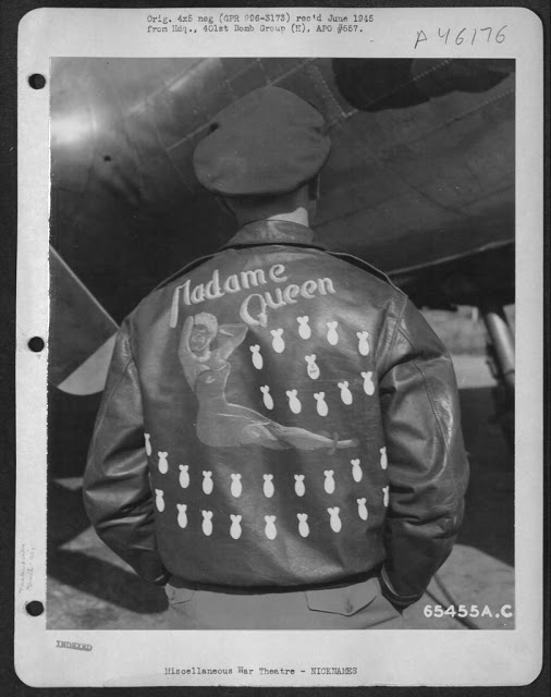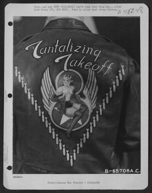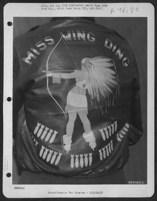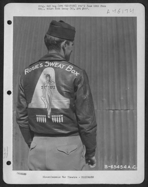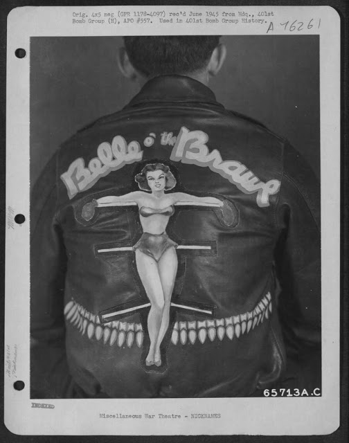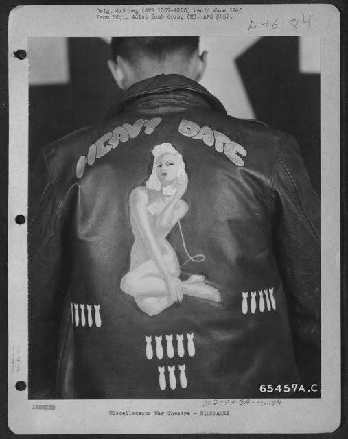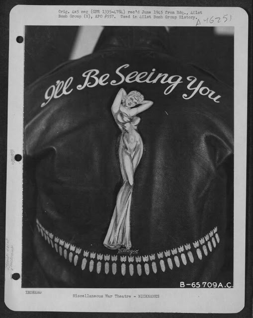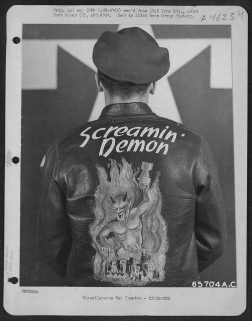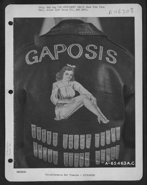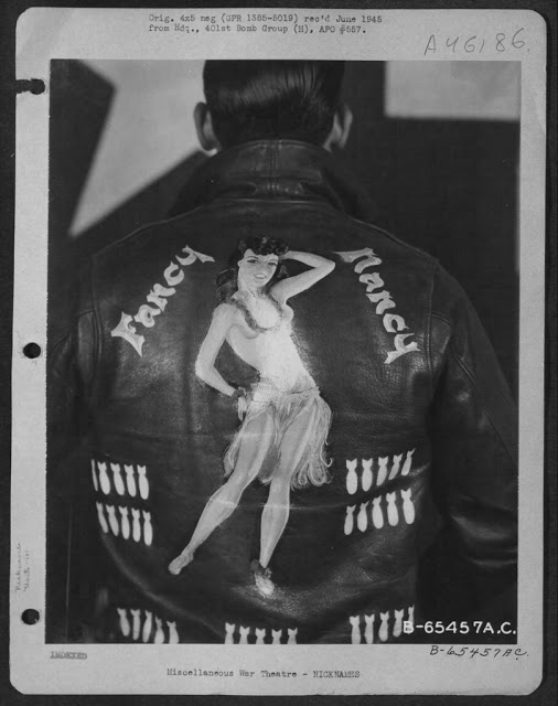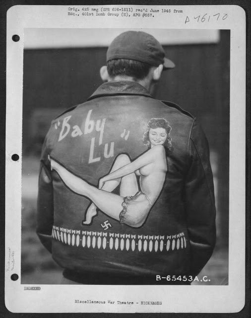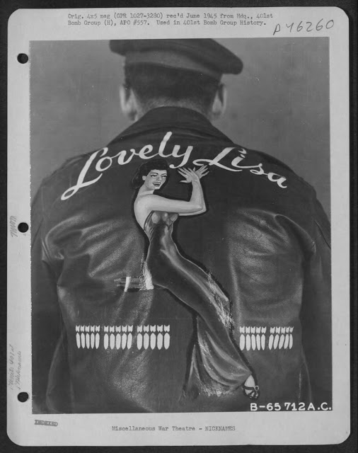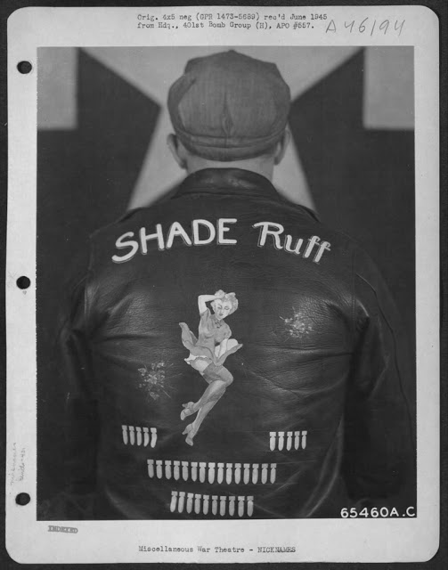 In WWII almost any kind of paint that could be used was used. Enamels if they could get it, lead based aviation paint, oil paint… whatever the ‘artist’ could get their hands on. Some squadron artists could only get their hands on yellow airplane paint, so the artwork on the jacket was done in yellow. As troops settled in, painting flight jackets became a cottage industry for the local artisans. Since some of the paints were not meant to be used on leather, they rubbed off, flaked off, and faded.