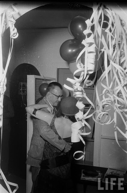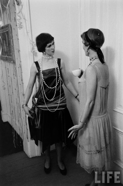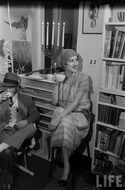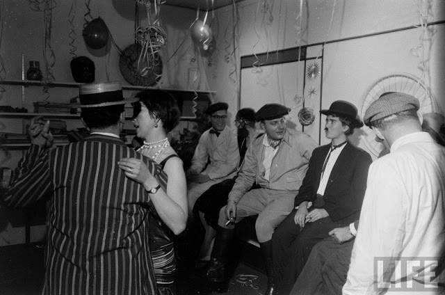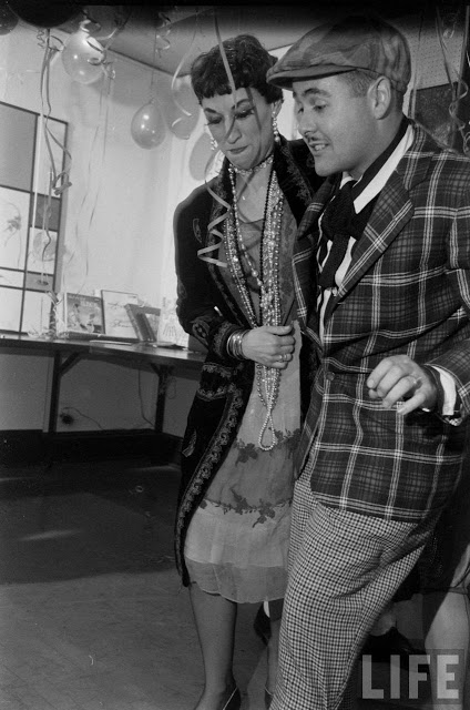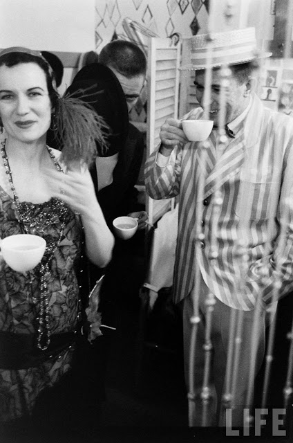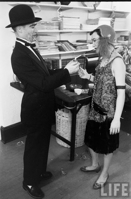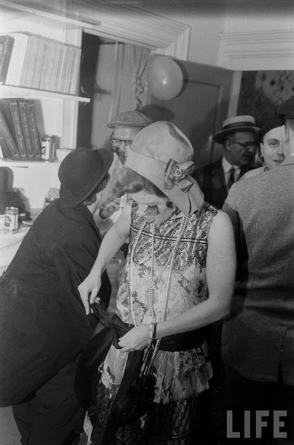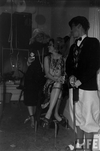 In fact, the 1920s party potential was already being seen by the 1950s. In these photos from 1954, partygoers have gone all out in their costumes (which, considering the decade only ended 24 years ago, are more than likely actually from it). Drinks are being sipped from teacups (though eventually many of the people give up and turn to cans of beer), a bathtub is used as a decoration/liquor holder, the ladies roll down their stockings and the men wear spats. It’s interesting to see that most of the people there were probably born in the 1920s, or slightly earlier… it’s the equivalent of a 1980s or even ’90s party today!