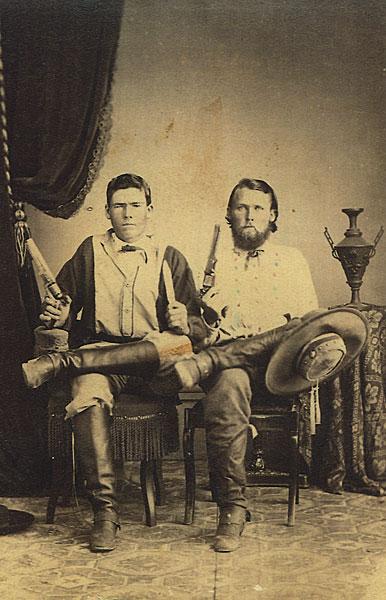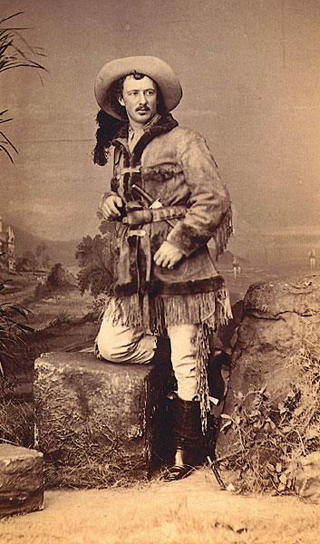 Much of the interest in the Old West was originally generated by the frontier characters who became showmen and carried the romance of the West all through this country and over to Europe. Texas Jack Omohundro was a genuine frontier scout before he joined Buffalo Bill Cody on the stage. It is said they were lousy actors, but they sure looked good! This photo shows us what the audiences saw onstage. You can see why they loved them, even if they could not act.