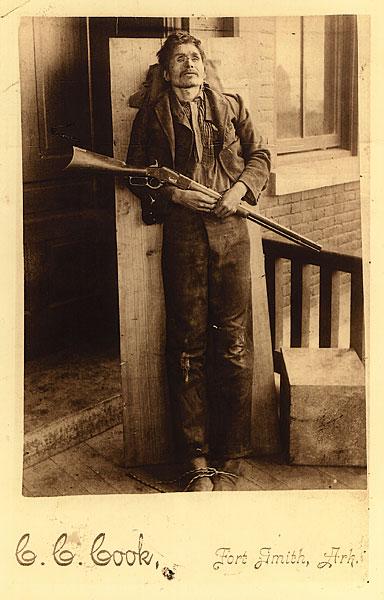 Ned Christie was not your typical bank- and train-robbing outlaw. He was a Cherokee whose crime was “running whiskey” and possibly horse theft. His notoriety came from the fight he waged against the lawmen trying to arrest him. As can be seen from this photo, he eventually lost, being gunned down in his fortified home on a mountaintop near Tahlequah, Cherokee Nation, in 1892. By the 1890s, photos such as these were often taken of dead outlaws, almost as if they were “trophies.”
