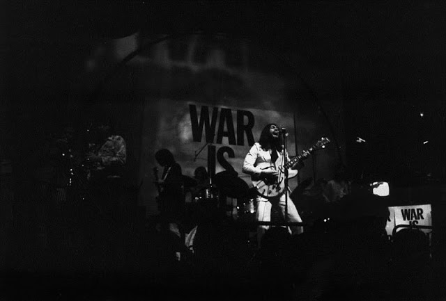 A huge War Is Over! banner was hung across the stage, and postcards were distributed to the audience.