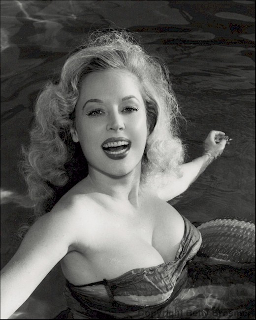 Back on the West Coast, Brosmer maintained a busy freelance workload in fashion and commercial modeling, while at the same time continuing her education, majoring in psychology at UCLA. She also entered into a lucrative contract with the glamour photographer Keith Bernard, and she worked steadily with him for the rest of the decade. For Bernard, a well-established photographer who had worked with Marilyn Monroe and Jayne Mansfield, Brosmer would prove to be the top-selling pin-up model of his career.[7] Brosmer’s publication work during the late 1950s includes appearances in Modern Man (October 1956, cover); Photoplay (April 1958, cover); and Rogue (July 1958 and February 1959, covers). During this time, Brosmer was said to be the highest paid pin-up model in the United States – she was seen in “virtually every men’s magazine of the era”.