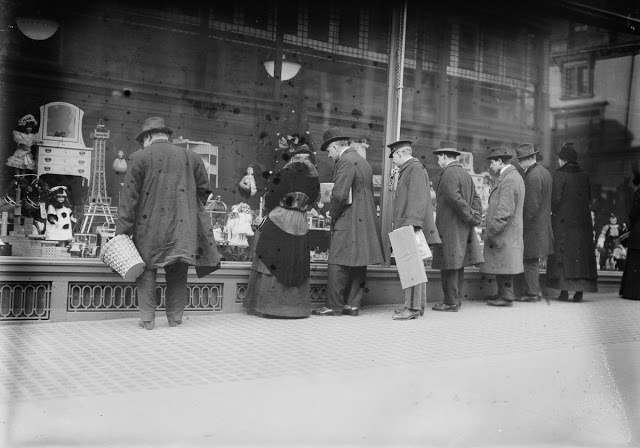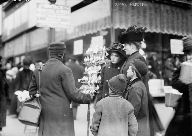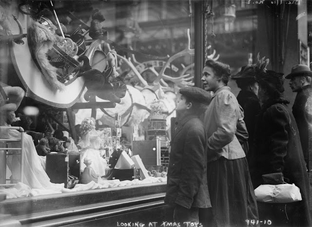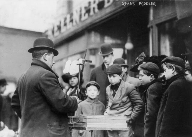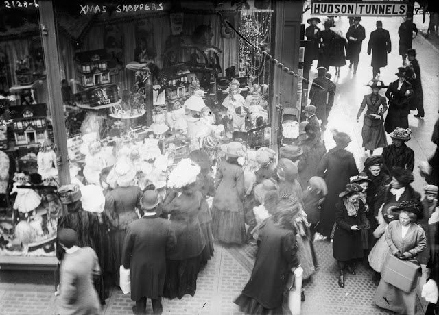 True, the streets don’t look as festive, and store facades aren’t as decked out as they are today. But in terms of the crowds, the vendors, and all the kids captivated by toy displays, holiday shopping in New York City hasn’t really changed much in the past century, as these photos from abut 1910 reveal.
