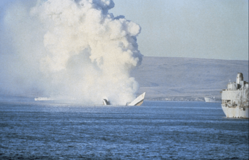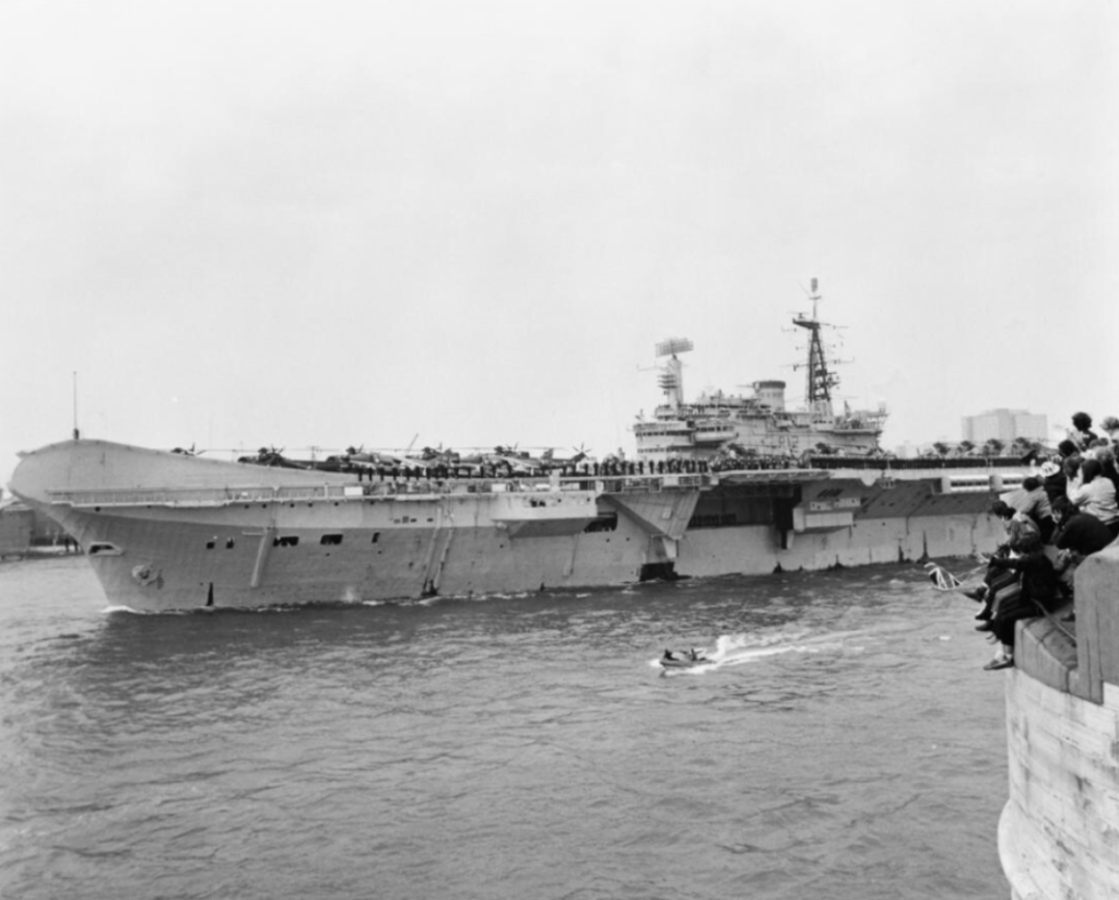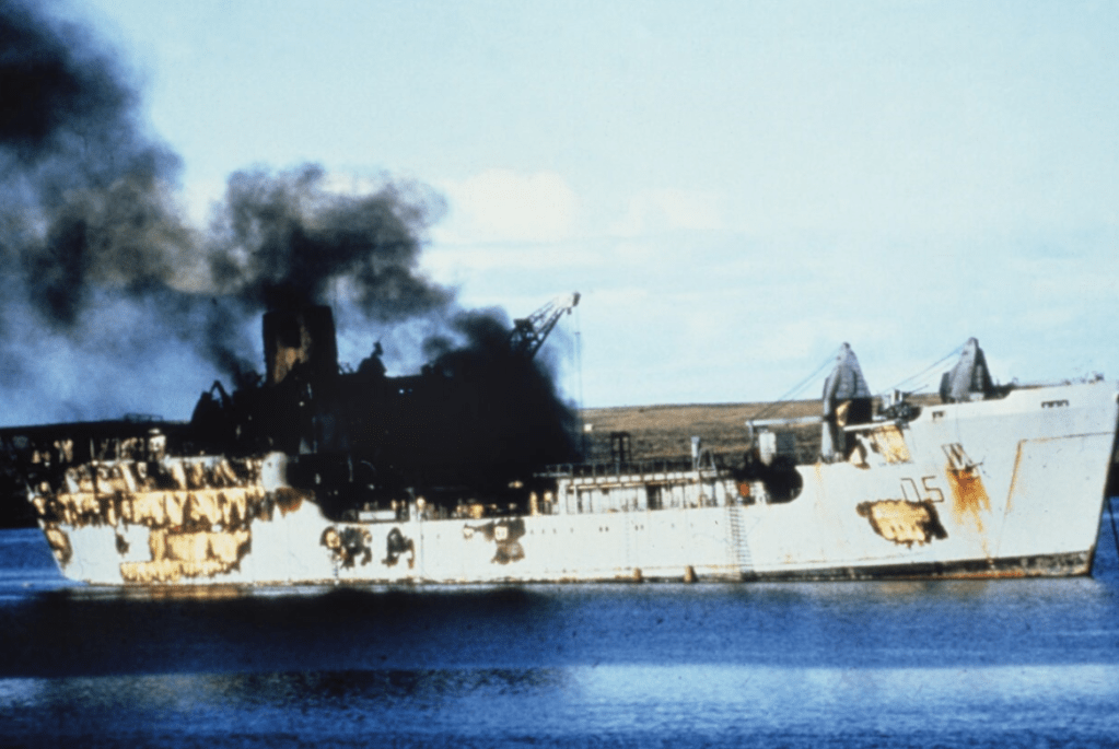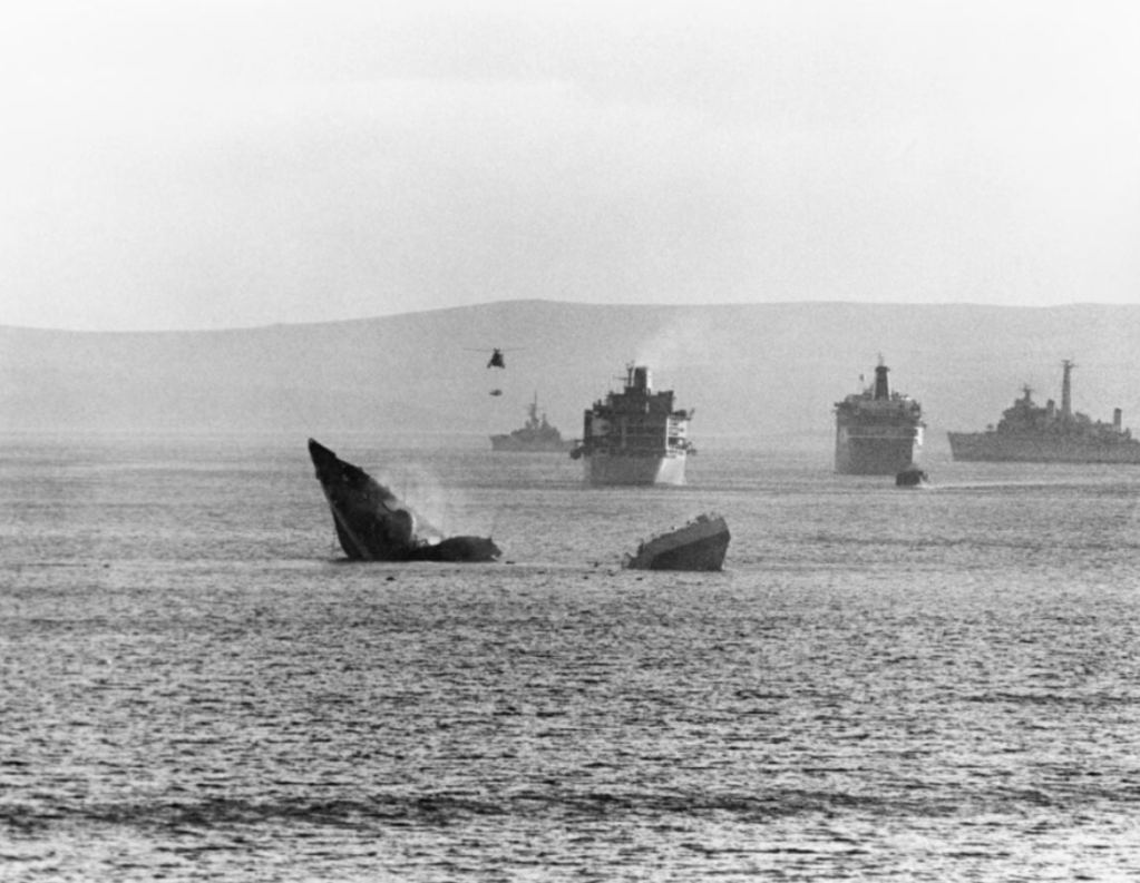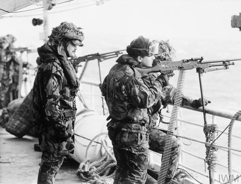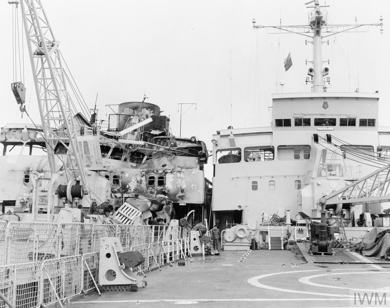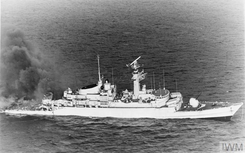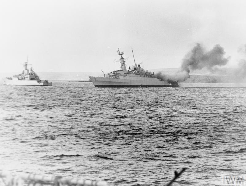HMS HERMES about to berth at Portsmouth Harbour on her return from the Falkland Islands, 21 July 1982.HMS HERMES passes HMS VICTORY as she enters Portsmouth harbour on returning from the Falklands on 21 July 1982.The aircraft carrier HMS HERMES sails out of Portsmouth for the South Atlantic, at the start of the Falklands War, 1982.HMS HERMES leaves Portsmouth for the South Atlantic, 5 April 1982.View from HMS HERMES of the vast number of small boats which welcomed the aircraft carrier home from the Falklands and escorted her into Portsmouth Harbour on 21 July 1982.Surrounded by life rafts launched by her crew, the Argentine cruiser GENERAL BELGRANO sinks after being torpedoed by the British submarine HMS CONQUEROR on 2 May 1982.THE FALKLANDS CONFLICT, APRIL – JUNE 1982 (FKD 4) The Churchill class nuclear powered submarine HMS CONQUEROR returns to her base at Faslane in Scotland on 3 July 1982 after deployment to the South Atlantic during which she sank the Argentine cruiser GENERAL BELGRANO on 2 May 1982. HMS CONQUEROR was the first nuclear submarine to sink another warship in combat. Two British Aerospace Sea Harrier FRS 1s in flight. They are from background to foreground: ZA176 and XZ451 both of 801 Naval Air Squadron.Two British Aerospace Sea Harrier FRS 1s in flight. Nearest to the camera is ZA176 of 801 Naval Air Squadron. The other aircraft is believed to be XZ451 also of 801 NAS.A formation of Royal Navy Sea Harriers in flight shortly before being deployed during the Falklands Conflict.THE FALKLANDS CONFLICT, APRIL – JUNE 1982 (FKD 83) A British Aerospace Sea Harrier (ZA177) of No 800 Naval Air Squadron, Fleet Air Arm, piloted by Lt Simon Hargreaves lands on the flight deck of the amphibious assault ship, HMS INTREPID during the Battle for Tumbledown on 13 June 1982. The Harrier was unable to use the SHEATHBILL temporary airstrip on the Falkland Islands and lacked the fuel to return to HMS HERMES. It therefore diverted to HMS INTREPID which had been recommissioned at the start of the Conflict.HMS PLYMOUTH on fire after being attacked by five Argentine Mirage aircraft on 8 June 1982. The ship was badly damaged but survived.HMS ARGONAUT on fire in San Carlos Water after being attacked and badly damaged in Argentine air attacks on 21 May 1982.The sinking of HMS ANTELOPE in San Carlos Water. The explosion of the second Argentine 1000-lb bomb on board the ship broke its back and cause the frigate to sink. A bomb disposal officer had been attempting to defuse the bomb at the time.The sinking of HMS ANTELOPE in San Carlos Water. Argentine 500lb bombs explode on board HMS ANTELOPE on the night of 23-24 May 1982. Two bombs had been dropped by an Argentine aircraft flying at extremely low level on HMS ANTELOPE during the day of 23 May. The bombs, which did not explode, lodged in the engine room of the ship. One detonated while it was being defused. The explosion broke the back of the ship which sank.The bow and stern sections of HMS ANTELOPE in San Carlos Water in the Falkland Islands after the ship was sunk by Argentine air attack on 24 May 1982.The sinking of the Royal Navy frigate HMS ARDENT. Close up showing the stern of HMS ARDENT on fire after being attacked for the second time in San Carlos Water by the Argentine Air Force on 21 May 1982. No fewer than five bombs had struck ARDENT’s hangar and flight deck area and 22 lives were lost.The sinking of the Royal Navy frigate HMS ARDENT. HMS ARDENT on fire, with HMS YARMOUTH alongside, after being attacked for the first time in San Carlos Water by the Argentine Air Force on 21 May 1982. The ship had been struck by two 1,000lb bombs and 22 lives lost. HMS YARMOUTH attempted to assist with firefighting and then evacuated the crew (who can be seen lining the side of the ship.Survivors of HMS ARDENT wearing “once-only” survival suits, on the flight deck of HMS YARMOUTH after abandoning ship in San Carlos Water on 21 May. HMS ARDENT had been damaged in two Argentine air attacks.The abandoned HMS ARDENT in San Carlos water after two Argentine air attacks. HMS YARMOUTH (left) pulls away from ARDENT after taking off her crew.A low aerial view of HMS ARDENT at anchor in San Carlos Water after being damaged in the stern by the first of two Argentine air attacks by A4-Q Skyhawks of the Argentine Navy’s 3rd Fighter Attack Squadron. In this attack, two 500lb bombs exploded in the Ship’s hangar, destroying the Westland Lynx helicopter and Seacat missile launcher. A third bomb lodged in the After Auxiliary Machinery Room without exploding. Although not disabled at the time of this photograph, the subsequent air attack brought the Ship to a halt. HMS ARDENT sank on 22 May.Damage to the hangar and after superstructure of HMS ARDENT sustained in two attacks in Falkland Sound by A4-Q Skyhawks of the Argentine Navy’s 3rd Fighter Attack Squadron in San Carlos Water on 21 May 1982. In the first attack, two 500-lb bombs exploded in the Ship’s hangar, destroying the Westland Lynx helicopter and Seacat missile launcher and a third lodged in the After Auxiliary Machinery Room without exploding. In the second attack, two more direct hits on the Ship’s stern caused the fires to spread out of control and brought her to a halt. Twenty two lives were lost during the attack. HMS ARDENT sank on 22 May.Lieutenant Commander N D Ward AFC RN, Commanding Officer of No 801 Naval Air Squadron, Fleet Air Arm on board HMS INVINCIBLE. The photograph is believed to have been taken on 21 May after Lt Cmdr Ward shot down an Argentine Mirage. He is seen here wearing his flying helmet.A Royal Navy gunner mans a deck mounted 7.62mm General Purpose machine gun for use against low-level Argentine air attack in San Carlos Water. He is wearing an anti flash hood and gauntlets as protection against the possibility of fire.Royal Marines from 3 Commando Brigade raise the Union Jack on landing at San Carlos beachhead during Operation SUTTON on 21 May 1982.The San Carlos land