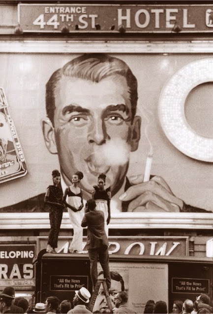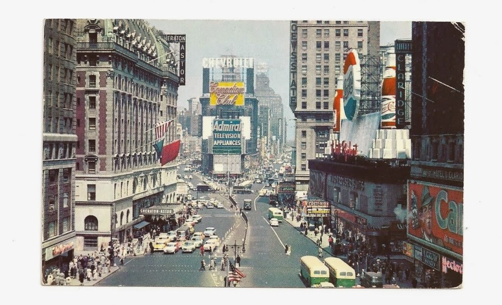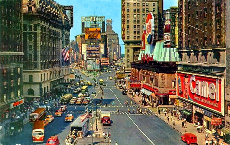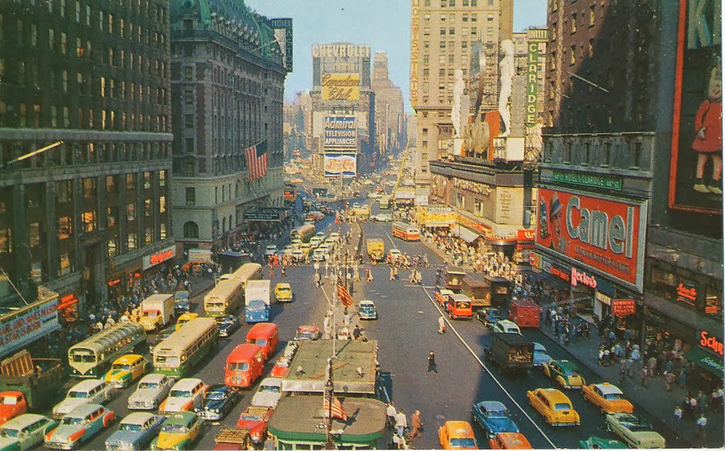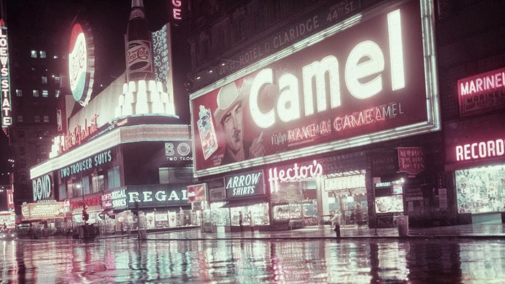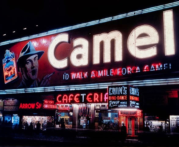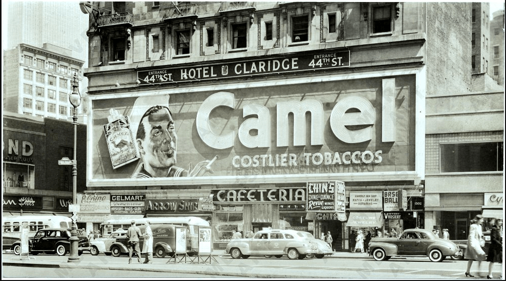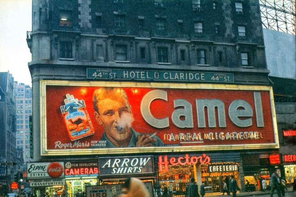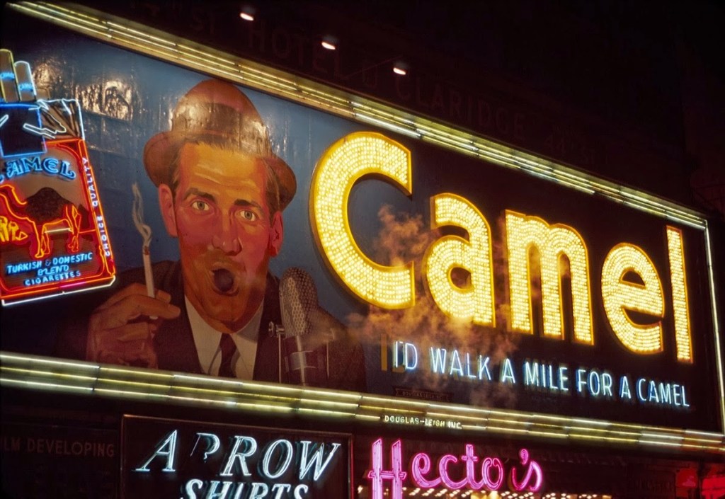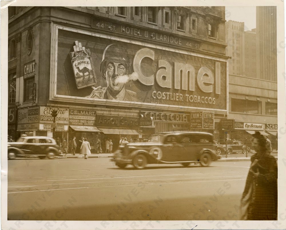 Before Times Square was all flat LCD panels its signs were far more textural. Bent tin, neon, flashing light bulbs, and all manner of mechanical contraptions animated the signs that covered the walls of the great canyon of advertising. One of the most famous signs from the 1930s through the ’60s was the Camel Cigarette sign. The makers tapped into the boiler system in the Con Ed Building, routing plumbing up to a hole in the sign, which every 4 seconds would release a “smoke” ring of steam through a ring shaped diaphragm and out of the hole. A rotating cast of faces were painted around the hole throughout the years to represent an assortment of Camel smokers, from WWII fighter pilots, to movie stars, to plain old businessmen.
