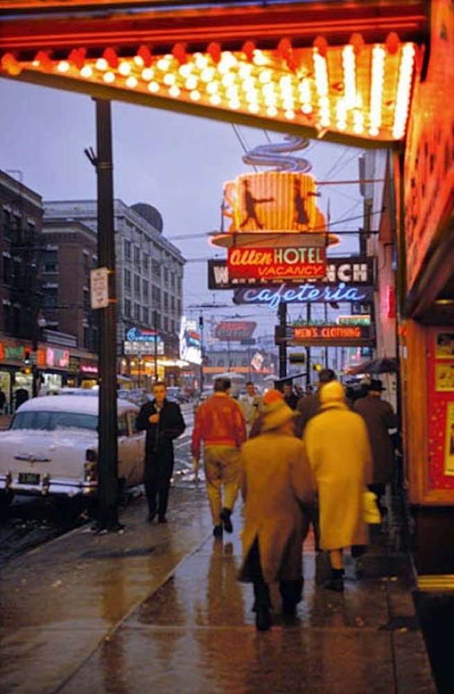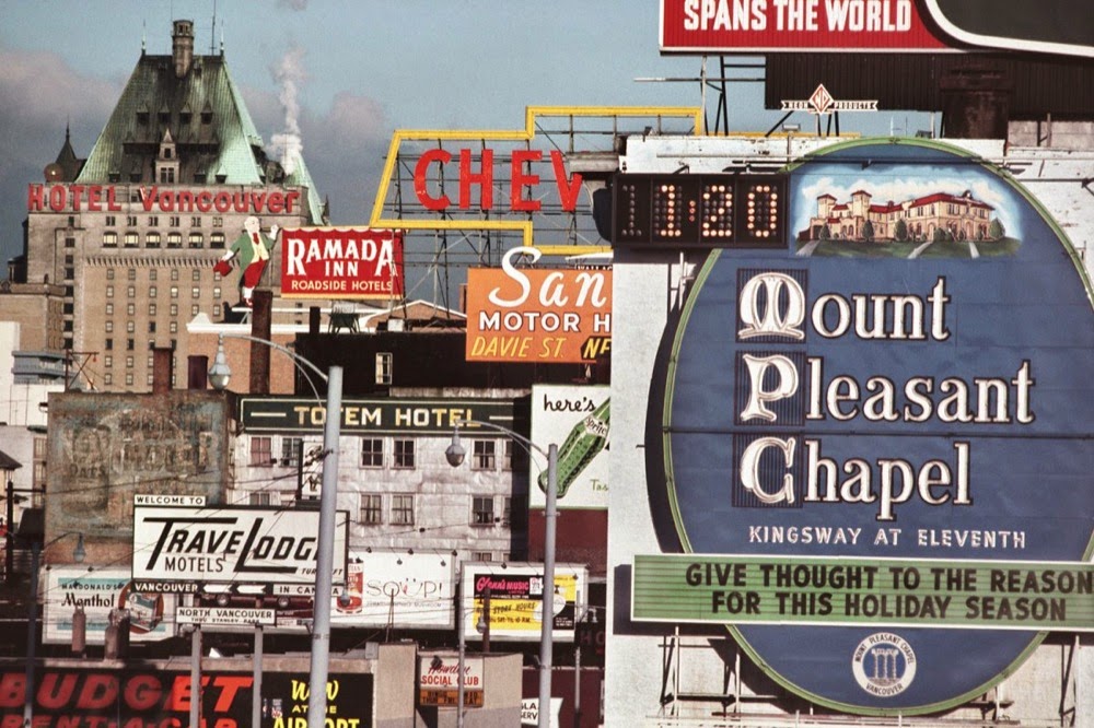 Over the next several years, Herzog read about technique, studied other photographers, and spent every spare moment shooting. His friendship with Marincowitz eventually led to getting a job as a medical photographer himself, first at St. Paul’s Hospital, and four years later at the University of British Columbia. Herzog was obsessed with the energy of the city. He was drawn to the neon signs, the colorful cars, the food markets, and billboards. He wanted to capture life as it was, to document the “American dream”. He wasn’t interested in commenting on social policy or expressing an opinion one way or another, just showing reality. This was one of the reasons he used color film. It was the way he saw the city and the way he wanted others to see it.