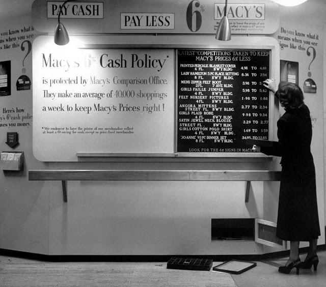 As the business grew, Macy’s expanded into neighboring buildings, opening more and more departments. The store used publicity devices such as a store Santa Claus, themed exhibits, and illuminated window displays to draw in customers. It also offered a money-back guarantee, although it accepted only cash into the 1950s. The store also produced its in-house made-to-measure clothing for both men and women, assembled in an on-site factory.