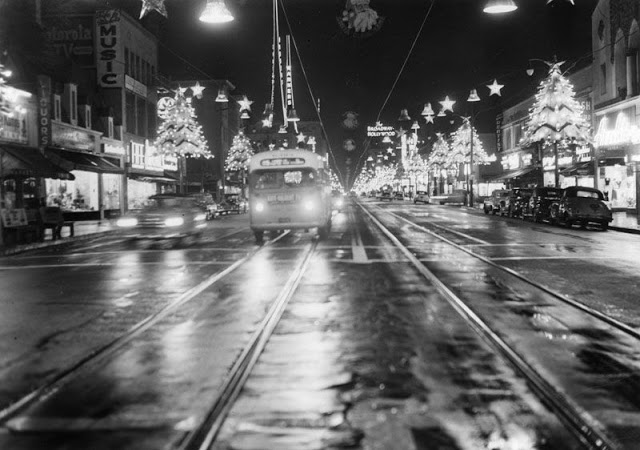 In later years, metallic decorations replaced the living trees. Drawings of film stars’ faces smiled at shoppers from the center of tin wreaths hung from lampposts. Whimsical, shiny toy Christmas trees blinked with colorful lights. At the annual promotion’s peak, organizers boasted that Hollywood Blvd. was the most brightly lit street in the nation.
