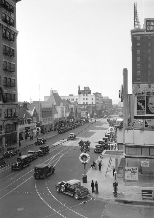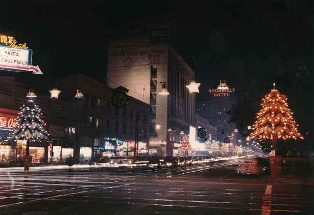 Mary Pickford turns Hollywood Blvd into Santa Claus Lane, 1928.Daytime view of the fir trees along Santa Claus Lane in 1928.In 1928, the first year Hollywood merchants organized Santa Claus Lane, live fir trees were transplanted from Big Bear.Another view of Hollywood Boulevard as Santa Claus Lane in 1928.Conical, metallic toy trees followed the wreaths on Hollywood’s Santa Claus Lane.Christmas decorations on Hollywood Boulevard, 1930.Claudette Colbert admires her oversized portrait lining Vine Street in Hollywood for the 1932 Santa Claus Lane shopping season.Sophisticated and charming, Colbert gave her parts a down-to-earth common sense and humorous attitude. She earned an Academy Award for her role in It Happened One Night (1934).Birdseye view of Santa Claus Lane and Vine Street in 1932.Actress Mary Pickford switches on Hollywood Boulevard’s holiday lights in 1935.View of a wet Hollywood Boulevard decorated for the holidays, 1935.Hollywood film stars accompanied St. Nicholas in the annual Santa Claus Lane Parade, 1935.Postcard of Santa Claus Lane in 1936.Light standards became Christmas trees on Santa Claus Lane, 1938.Looking north from the Owl Drug Store at 6290 Hollywood Boulevard, 1940. California Bank and the Equitable Building can be seen across the street.A woman in a fashionable dress walking west on the south side of Hollywood Boulevard just west of Vine Street, 1944.Santa Claus Lane Parade in 1945.Cars driving along the street in Hollywood called Santa Claus Lane at Christmas time, 1945.A crowd looking at the electric billboard on the Taft Building, 1945. The view is from the north-west corner of Hollywood and Vine looking south-east. An early traffic sign is in the foreground and in the background the distinctive “hat” of the Brown Derby sign is visible.A well-lit Hollywood Boulevard during the Holiday Season, 1946. The Broadway Building and Kress building are in the distance, and Shaw’s can be seen at right.View of Hollywood Boulevard decorated as Santa Claus Lane, 1948Hollywood Boulevard decorated for the holidays, 1950.Hollywood Boulevard decorated for the holidays, ca. 1950.Hollywood Boulevard decorated for the holidays, ca. 1950.A Pacific Electric streetcar ambles down Hollywood Boulevard at Ivar Street in 1953, the last year streetcars would take part in Tinseltown’s Yuletide festivities.With an old LA Red Car trolley giving it a touch of holiday color, Grauman’s Chinese Theater on Hollywood Boulevard at Christmas time, 1953.