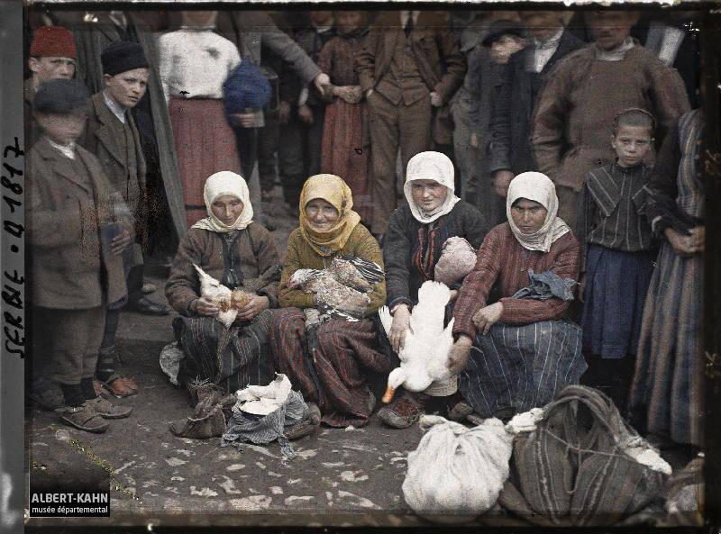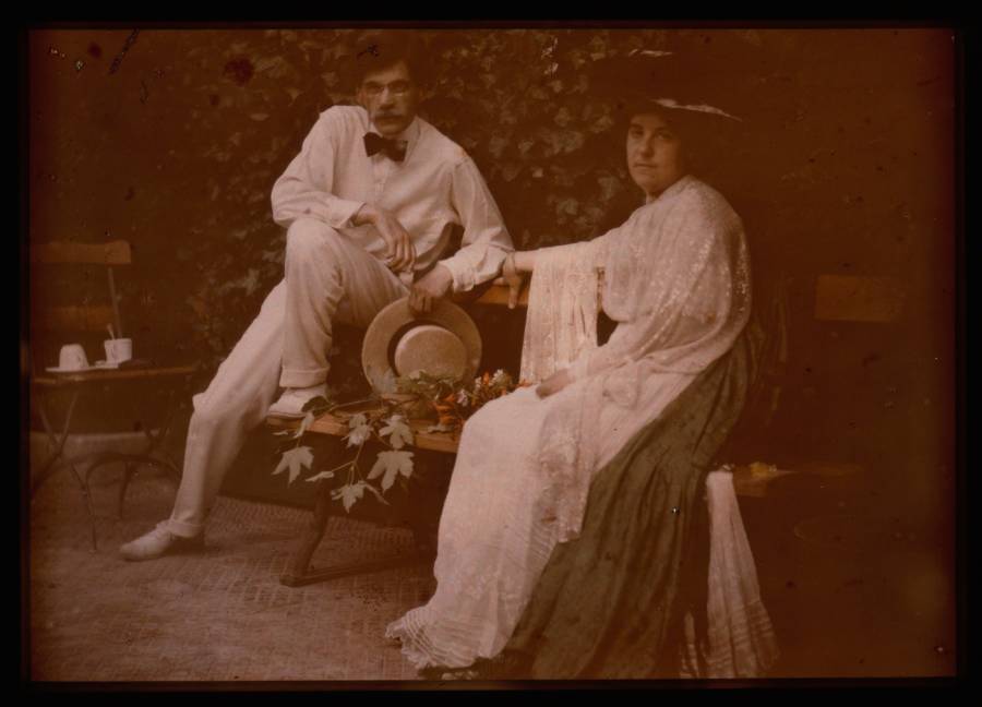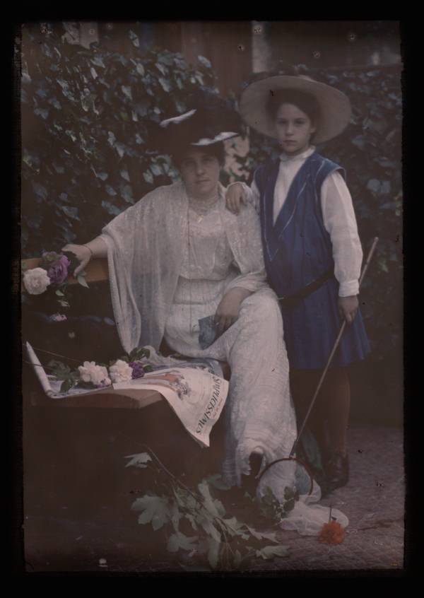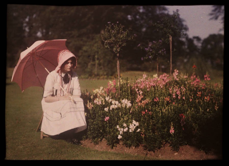 Christina, the daughter of Autochrome photographer Mervyn O’Gorman, poses in a red cloak in order to be photographed by her father. Dorset, England. 1913.The daughter of Autochrome photographer Etheldreda Janet Laing poses in a kimono in order to be photographed by her mother. England. 1908.A little girl plays with her doll next to two guns and a knapsack in Reims, France during World War I. 1917.Two men play chess in Hoboken, N.J. 1907.Christina sits beside a boat. 1913.Two women sit on a bench. Location unspecified. 1915.Christina poses with a purple Buddleia flower. 1915A woman with tattooed arms poses in Bosnia. 1912.Christina sits on the beach. 1913.French soldiers prepare lunch outdoors. 1910.Children pose in costume during World War I. France. 1914.A little girl in a red riding hood poses near some flowers. England. 1907.Christina walks on the beach. 1913.Three little girls sit on the terrace next to Kastel Fortress in Bosnia. 1912.Else Paneth (left), the wife of Austrian chemist and photographer Friedrich Paneth, sits on a camel in Egpyt. 1913.“Mother and Child.” 1910.Children play in the ruins of Reims, France during World War I. 1917.Constantin Mitrofanovitch Flórinsky, officer of Tsar Nicholas II of Russia. 1907.“The Last Digger.” United Kingdom. 1910.Two couples of tennis players sit on a bench in France. 1912.A local stands next to a cart in Cairo, Egypt. 1914.Photographer Frank Eugene poses for an Autochrome in Hoboken, N.J. 1907.The daughter of photographer Frank Eugene poses with photographer Alfred Stieglitz. Location unspecified. 1907.Emmy (left), the daughter of Autochrome photographer Frank Eugene. Tutzing, Bavaria. 1907.Selma Schubart, the sister of photographer Alfred Stieglitz. Hoboken, N.J. 1907.Katherine Stieglitz, the daughter of photographer Alfred Stieglitz. 1910.A family poses for an Autochrome outdoors. 1915A gardener holds tomatoes in his apron. United Kingdom. 1905.Tamara Karasavina, a leading dancer in the Russian ballet, poses next to some flowers. 1908An Italian rifleman poses in Verona, Italy. 1918.A family stands on the beach in Margate, England. 1915.A man drives a British-made Lanchester automobile. 1913Two girls sit in a field. England. 1908.A condemned prisoner stands in chains in Ulaanbaatar, Mongolia. 1913.The Moulin Rouge. Paris. 1914.Olga Victorovna Dmitrieff sits outdoors on a bench. Russia. 1907.The daughters of Autochrome photographer Etheldreda Janet Laing pose on a balcony. England. 1908.A group of Serbian women sit in a market square. 1913.The daughter of photographer Etheldreda Janet Laing sits with a parasol sitting by a flower bed. England. 1908.Porte Saint-Denis. Paris. 1914.A man poses in a red sweater. Hoboken, N.J. 1907.Russian soldiers pose amid the ruins at Reims, France during World War I. 1917.A young girl poses near some flowers. England. 1910.A girl poses in traditional dress in Madeira, Portugal. 1910.