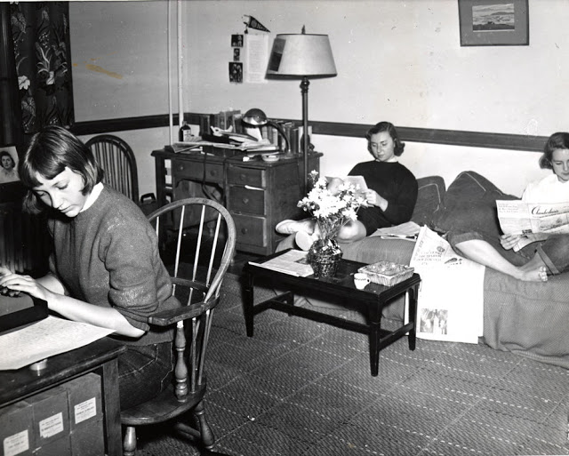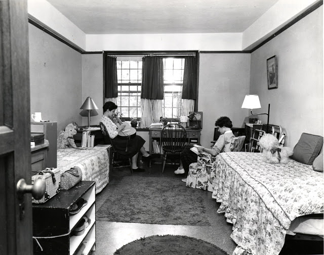 Students in a dorm room share a telephone, 1951.A student ‘studies’ in her dorm room, 1951.A student hugs her pillow while sleeping in her dorm room, 1951.A sleepy student grabs for her alarm clock, 1951.Students contemplate cleaning a messy dorm room, 1951.A student enlists the aid of her friends to select the proper dress for the night, 1951.Students relax in a dorm room, 1953.A student opens a care package from home in her dorm room, 1953.Students at work in their dorm room, 1953.Students play records and knit while relaxing in their dorm room, 1953.Students play cards and relax in the dorms, 1953.Students study and relax in their dorm room, 1956.A student packs her suitcase in the dorms, 1956.Students listen to music on an LP record player in a dorm room, 1956.Students relax in a dorm room, 1956.A dorm room in Main Building, 1959.A student studies in her dorm room, 1959.A student lounges while studying in her dorm room, 1950s.Students study in their dorm room, 1950s.Students gather to study in the dorms, 1950s.Students study and relax in their dorm room, 1950s.Students play records in their dorm room, 1950s.Students play cards in the dorms, 1950s.A student makes herself comfortable while talking on the telephone in the 1950s.Students talk on the phone and relax in their dorm room, 1950s.Students play cards and socialize in the dorms, 1950s.Students study graphs in their dorm room, 1950s.A student studies in her dorm room, 1950s.Students studying in their dorm room, 1950s.Students share a laugh while talking on a sofa in the dorms, 1950s.