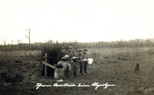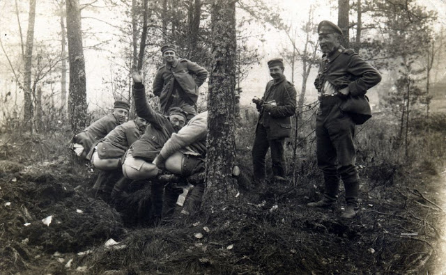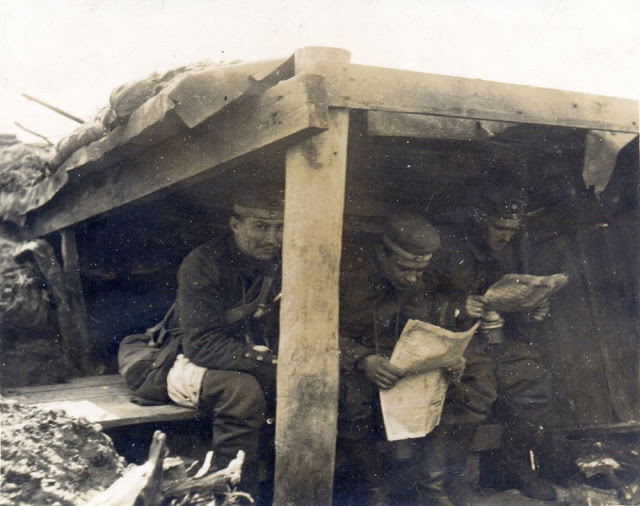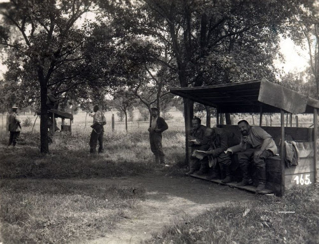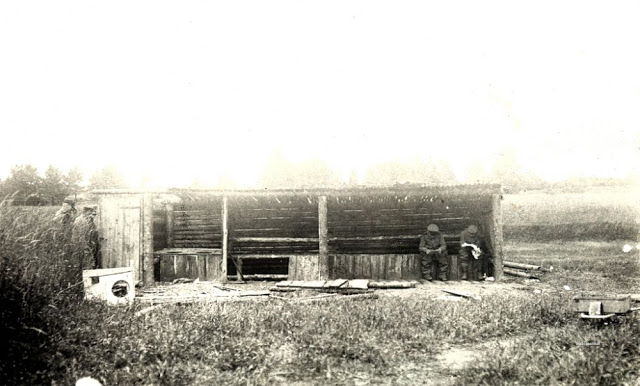 The latrines was the name given to trench toilets. They were usually pits, 4 ft. to 5 ft. deep, dug at the end of a short sap. Each company had two sanitary personnel whose job it was to keep the latrines in good condition. In many units, officers gave out sanitary duty as a punishment for breaking army regulations. Before a change-over in the trenches, the out-going unit was supposed to fill in its latrines and dig a new one for the new arrivals.