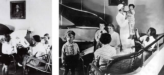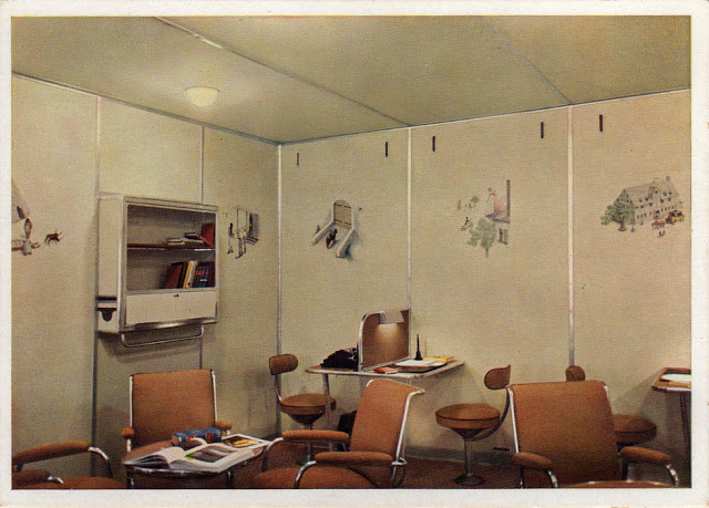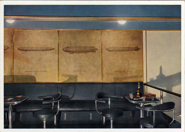 Perhaps most surprising, aboard a hydrogen airship, there was also a smoking room on the Hindenburg. The smoking room was kept at higher than ambient pressure, so that no leaking hydrogen could enter the room, and the smoking room and its associated bar were separated from the rest of the ship by a double-door airlock. One electric lighter was provided, as no open flames were allowed aboard the ship. The smoking room was painted blue, with dark blue-grey leather furniture, and the walls were decorated with yellow pigskin and illustrations by Otto Arpke depicting the history of lighter-than-air flight from the Montgolfiers’s balloon to the Graf Zeppelin. Along one side of the room was a railing above sealed windows, through which passengers could look down on the ocean or landscape passing below.