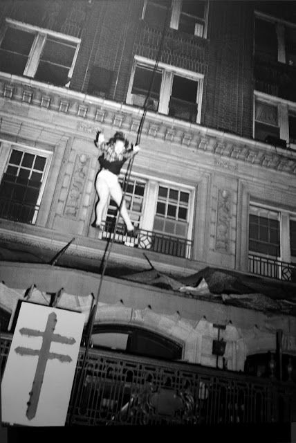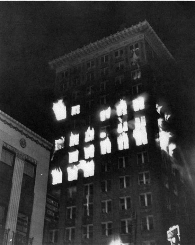 “The trapped victims were descending ropes of blankets and bed sheets in desperate attempts to reach the fully extended ladders.” (On hearing a bystander shriek) “I looked up, raising my camera. A woman was plummeting downward. As she passed the third floor, I fired, using my last flashbulb.”