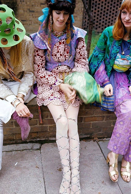Psychedelic sensibility was essential to the second phase of 1960s’ fashion vocabulary, the move away from some of the sleeker and brusquer characteristics of mod fashion. It was consanguineous with the second phase’s absorption of folk and tribal lexicon, the experimentation in role playing and persona construction made possible by the improvised costumes adopted by youth cultures and spilling out into the Western world’s clothes-wearing population at large. The unprecedented outfits certainly owed something to the phantasmagoria of acid visions. Tribal and psychedelic converged with mottled patterns of African and Indonesian fabrics, the phosphorescent splotches and showers of tie-dye.
