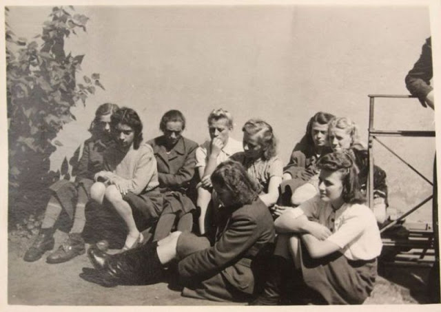 19 April 1945 Bergen-Belsen SS women camp guards are paraded for work in clearing the dead. The women include Hildegard Kanbach (first from left), Magdalene Kessel (second from left), Irene Haschke (centre, third from right), the Head Wardress, Herta Ehlert (second from right, partially hidden) and Herta Bothe (first from right). Herta Bothe (also known as Hertha Bothe) accompanied a death march of women from central Poland to Bergen-Belsen. She was sentenced to 10 years imprisonment and released early from prison on 22 December 1951. Elisabeth Volkenrath was head wardress of the camp and sentenced to death. She was hanged on 13 December 1945. Irene Haschke was sentenced to 10 years imprisonment.