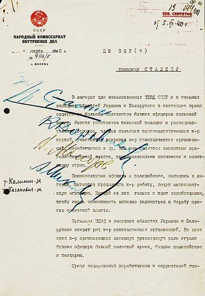 The massacre was initiated in NKVD chief Lavrentiy Beria’s proposal to Joseph Stalin to execute all captive members of the Polish officer corps, which was approved by the Soviet Politburo led by Stalin. Of the total killed, about 8,000 were officers imprisoned during the 1939 Soviet invasion of Poland, another 6,000 were police officers, and the remaining 8,000 were Polish intelligentsia the Soviets deemed to be “intelligence agents, gendarmes, landowners, saboteurs, factory owners, lawyers, officials, and priests”. The Polish Army officer class was representative of the multi-ethnic Polish state; the murdered included ethnic Poles, Ukrainians, Belarusians, and Jews including the chief Rabbi of the Polish Army, Baruch Steinberg.