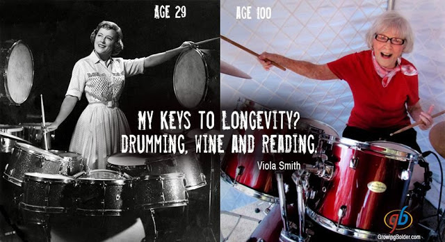 Several years ago she retired from teaching drums. Explaining her longevity, she said: “I definitely think that the exercise involved in drumming contributes to longevity. Spending two summers in Europe in 1942 and ‘44 started the wine habit: two glasses with dinner. Also hearing about a wine drinking community in Southern France where the longevity far exceeds that of the country as a whole. Thirdly, reading all of Adele Davis’ books over several decades ago, on a recipe for a long life.”