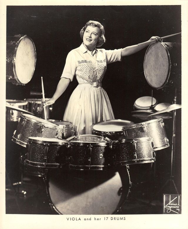 Since the 1940s, Smith has had a long and active career as a performer and teacher. Drumming every week from 1942 though 1954 on General Electric’s national syndicated radio program with Phil Spitalny’s all woman Hour of Charm Orchestra, Viola remained in demand long after the war ended. Movie appearances, drumming at President Truman’s inauguration celebration, The Ed Sullivan Show, playing on Broadway for the original run of Cabaret – she did it all!