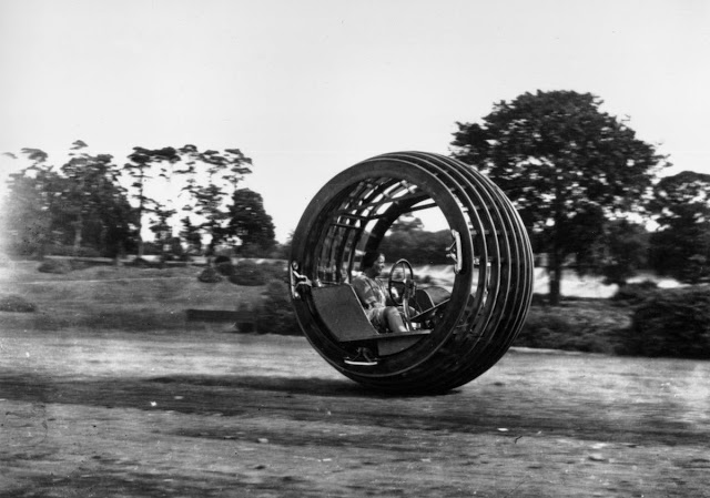 Arguably the most well-known iteration of the strange type of vehicle is the one above, created in 1932 by Dr. J.H. Purves. The motorized monster was called the Dynasphere, and it is believed to have reached speeds of up to 25 or 30 MPH.