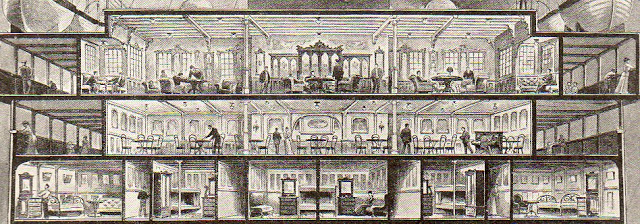 Cross section of the HMS Olympic, giving an idea of her tremendous size and capacity. This cross section appeared in the 14 August 1909 issue of The Illustrated London News, just six months or so after she was laid down.