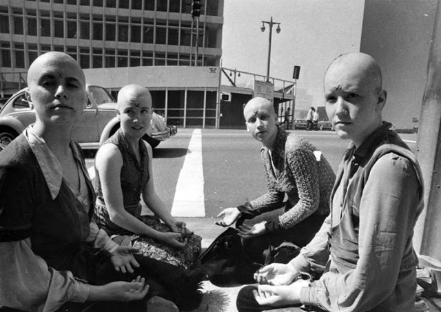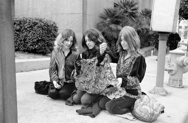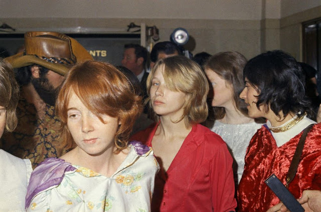 Four young female members of the Charles Manson “family” kneel outside the Los Angeles Hall of Justice on March 29, 1971, with their heads shaved. The women kept a vigil at the building throughout the long trial in which Manson and three others were convicted of murdering actress Sharon Tate and six others.Nancy Pitman (a.k.a Brenda McCann), Sandra Good, Catherine Gillies, and Mary (Mary Theresa Brunner) dubbed “the girls on the corner.” They shaved their heads along with Manson, Atkins, Krenwinkel, and Van Houten following the guilty verdicts, telling reporters, “You’d better watch your children because Judgment Day is coming!Kathryn “Kitty” Lutesinger, a Charles Manson “Family” member, on Temple Street during Manson’s trial for the Tate-LaBianca murders.Members of Charles Manson’s “family” (L-R Sandra Good, Nancy “Brenda McCann” Pitman, and Kitty Lutesinger) hold vigil outside the Los Angeles Hall of Justice, embroidering a vest for the leader who is on trial for murder on January 24, 1971. (David F. Smith / Associated Press)Manson family members seen outside of Grand Jury Room 548, 1971. (Herald-Examiner Collection/Los Angeles Public Library)Manson Family members in the courtroom, 1970.Manson cult members receive the news that Charles Manson and his three female co-defendants had been found guilty of murder, January 26, 1971.From left: Susan Atkins, Patricia Krenwinkel and Leslie Van Houten are shown en route to court in Los Angeles in August 1970. The three women, displaying the symbol X on their foreheads as followers of the Manson cult family, were convicted for killings that included actress Sharon Tate.Charles Manson is escorted to his arraignment on conspiracy-murder charges in connection with the Sharon Tate murder case, 1969, Los Angeles, Calif.Charles Manson walks into the courtroom in Santa Monica on Oct. 13, 1970. Susan Atkins, seated, a member of Manson’s “family” of followers, pleaded guilty to charges of murdering Malibu musician Gary Hinman.Members of Charles Manson’s “family” are shown outside the courtroom in the Los Angeles Hall of Justice after a hearing on Jan. 27, 1970. Identifiable are Lynette Fromme, foreground left, and Catherine “Gypsy” Share, far right.When asked by a newsman, “Are you insane, Charlie?” during a March 19, 1970, interview in Los Angeles, Manson answered: “It all depends on your point of view.”The 500-acre Spahn Movie Ranch in the Santa Susana Mountains is where Charles Manson and his “family” lived at the time of the Tate-LaBianca murders in 1969.The body of actress Sharon Tate is taken from her Benedict Canyon estate where she and four other people were killed the night of Aug. 9, 1969, in Los Angeles.Manson Family members outside a courtroom during the Tate-LaBianca murder trial, 1970.Manson Family members outside a courtroom during the Tate-LaBianca murder trial, 1970.Charles Manson “Family” members, Kathryn “Kitty” Lutesinger, left, and Nancy Pitman (a.k.a Brenda McCann), on Temple Street during Manson’s trial for the Tate-LaBianca murders, 1970.Catherine Gillies with “X” carved into her forehead.Manson follower Sandra Good, 1970.Cult leader Charles Manson looks back and smiles after being charged with eight murders on December 4, 1969.An original booking mug shows Charles Manson at the Ventura County Sheriff’s Department in 1968.