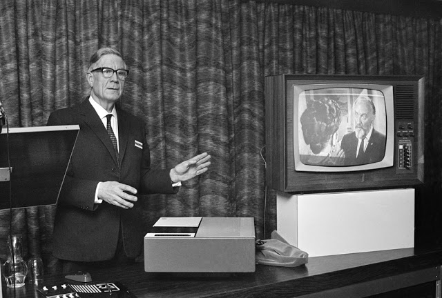 Dr E. F. Alexanderson of GE and RCA and inventor of the radio television process where a listener can see as well as listen to the broadcast, operating his 3 inch screen home television set, Schenectady, New York, January 14, 1928.People watching a television set at Waterloo station, London, August 1936.Undated (circa 1940s) early family television time.Early days of television in Sweden, 1953. The aerial is mounted by two men in white coats.A family watching television in their home, circa 1955.A couple watching a portable TV in the living room. USA, circa 1960s.Gina Lollobrigida watches President Kennedy on a television set in her Rome villa, July 23, 1962 during live telecast from the U.S. to Europe via the Telstar satellite. The Italian actress left the set of her present movie to watch the program which included a portion of the President’s news conference, in Washington.The first transmission with six monitors to Europe of television programmes from America via the Telstar satellite. 23rd July 1962.The Telstar satellite, designed by Bell Telephone Laboratories for relaying telephone calls, data messages and television signals, is shown in 1962.With the start of pay television close in California, John Garrott installs a program selector unit on a television set in Los Angeles, California, July 23, 1964.Prototype VCR shown in the U.K. in 1968.The new EVR system which allows the recording of television programmes which can then be watched at the owner’s discretion. The new Teleplayer has been produced in partnership with Rank Bush Murphy Ltd and EVR and has enormous potential. 21st September 1970.Roy H. Pollack, vice president and general manager of RCA Corporation consumer electronics, demonstrates a new video tape machine Introduced in New York, August 23, 1977. The recorder, intended for home use, will be priced at $1,000, and will be capable of handling cassettes that can record up to four hours of television programs. Cassettes now available record up to two hours.Bert Jett proudly stands in the yard of his home near Blue Creek, where he and his two brothers have installed a $7,800 satellite receiving dish so they can get better TV reception in Elkview, W.Va., July 14, 1981. The Jetts said they now can get nearly 60 stations around the globe and have their choice of four separate movie channels, as well as several Christian networks and most of the big city TV stations in this country.