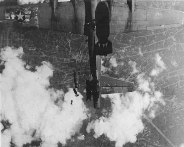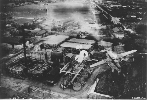 Just as it released its string of para-frags B-25 NO. 192 was hit by flak from a camouflaged battery and trails smoke and a gaping hole is visible on the pilot’s s side.