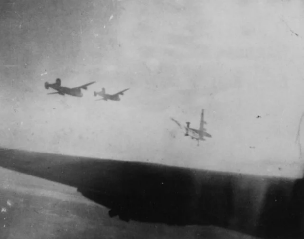 This section was led by Captain Jack W. Klein (taking the photos), followed by 2nd Lt. Melvin H. Kapson (the other aircraft visible) and 1st Lt. James L. Knarr.