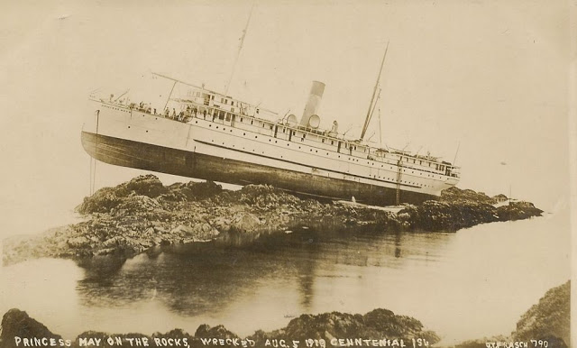 Remarkable images of the steamship Princess May, resting at a seemingly impossible angle, after running aground on rocks in the Lynn Canal, Alaska on 5 August 1910. The passengers, crew and cargo (including a shipment of gold) were all evacuated safely.