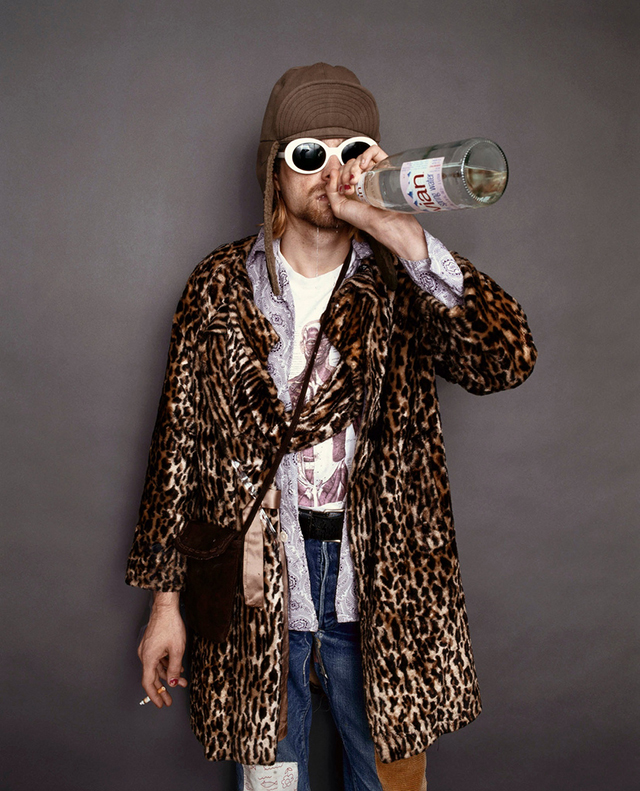 Band members Dave Grohl and Krist Novocelic arrived promptly at 11:00 a.m., when the shoot was to begin, but lead singer Kurt Cobain was nowhere to be found. Three hours later, Cobain showed up in a pair of large, white Jackie O sunglasses. In a whisper, he asked for a bucket.