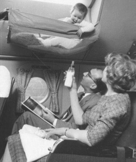 Incredible vintage images, dating back to the 1950s, have emerged revealing that ‘skycots’ were attached to the overhead luggage bin, with children placed inside for the journey’s duration.